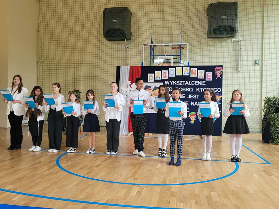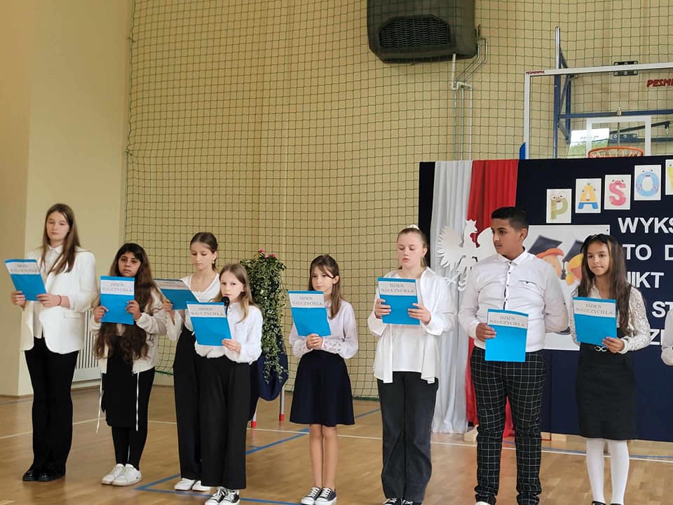 Dzisiejszy dzień w naszej szkole łączył w sobie dwie uroczystości: Dzień Nauczyciela i Pasowanie na ucznia klasy I. Już od niepamiętnych czasów dzień 14 października obchodzony jest jako Dzień Edukacji Narodowej. W tym roku przypada 250 rocznica utworzenia Komisji Edukacji Narodowej. W ramach jego obchodów uczniowie dziękują nauczycielom, wychowawcom szkolnym i przedszkolnym, a także pracownikom zatrudnionym w jednostkach oświatowych. Pani Dyrektor i Przewodnicząca Rady Rodziców podziękowały nauczycielom za trud, cierpliwość, zaangażowanie wkładane w edukację i wychowanie młodego pokolenia. Wszystkim nauczycielom i pracownikom z okazji ich święta życzymy dalszych sukcesów, wytrwałości i satysfakcji z pracy. Szanowni Nauczyciele! Dziękujemy za serce, uśmiech, dobre słowo, Za pomoc w odkrywaniu tego w czym jesteśmy najlepsi i przekonanie, że możemy zrobić więcej niż się spodziewamy.