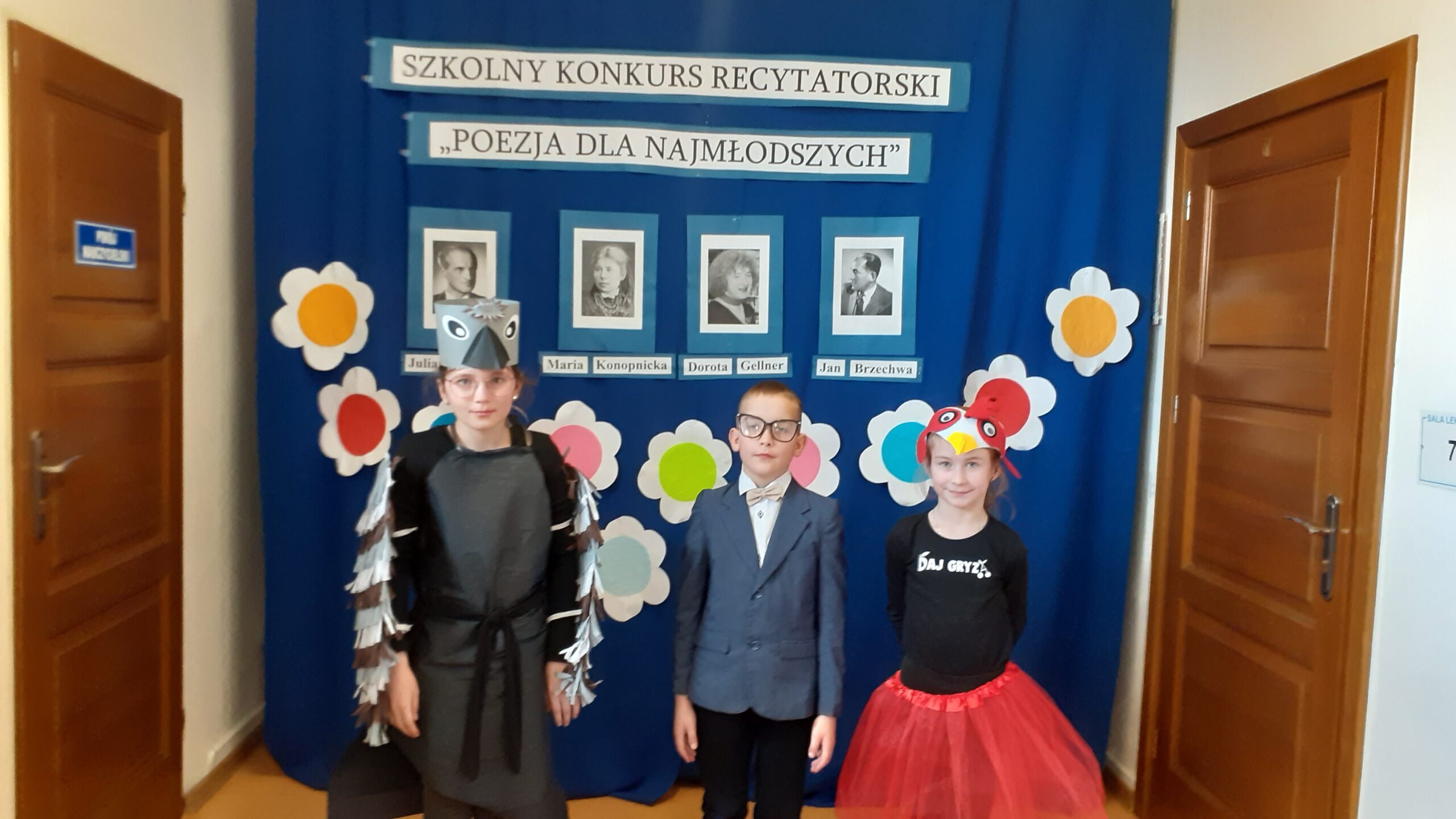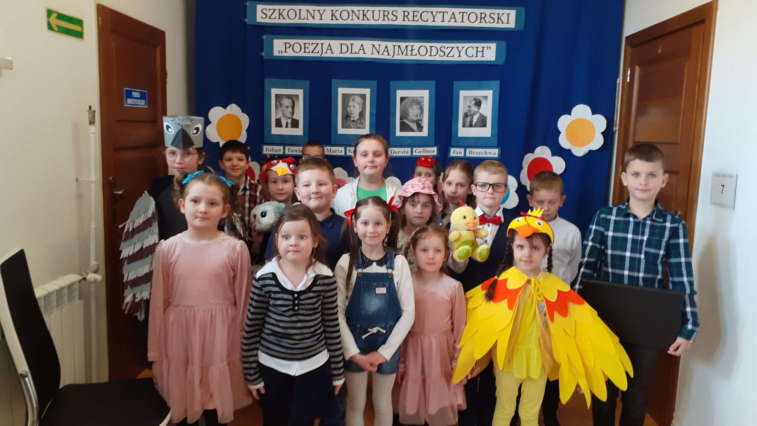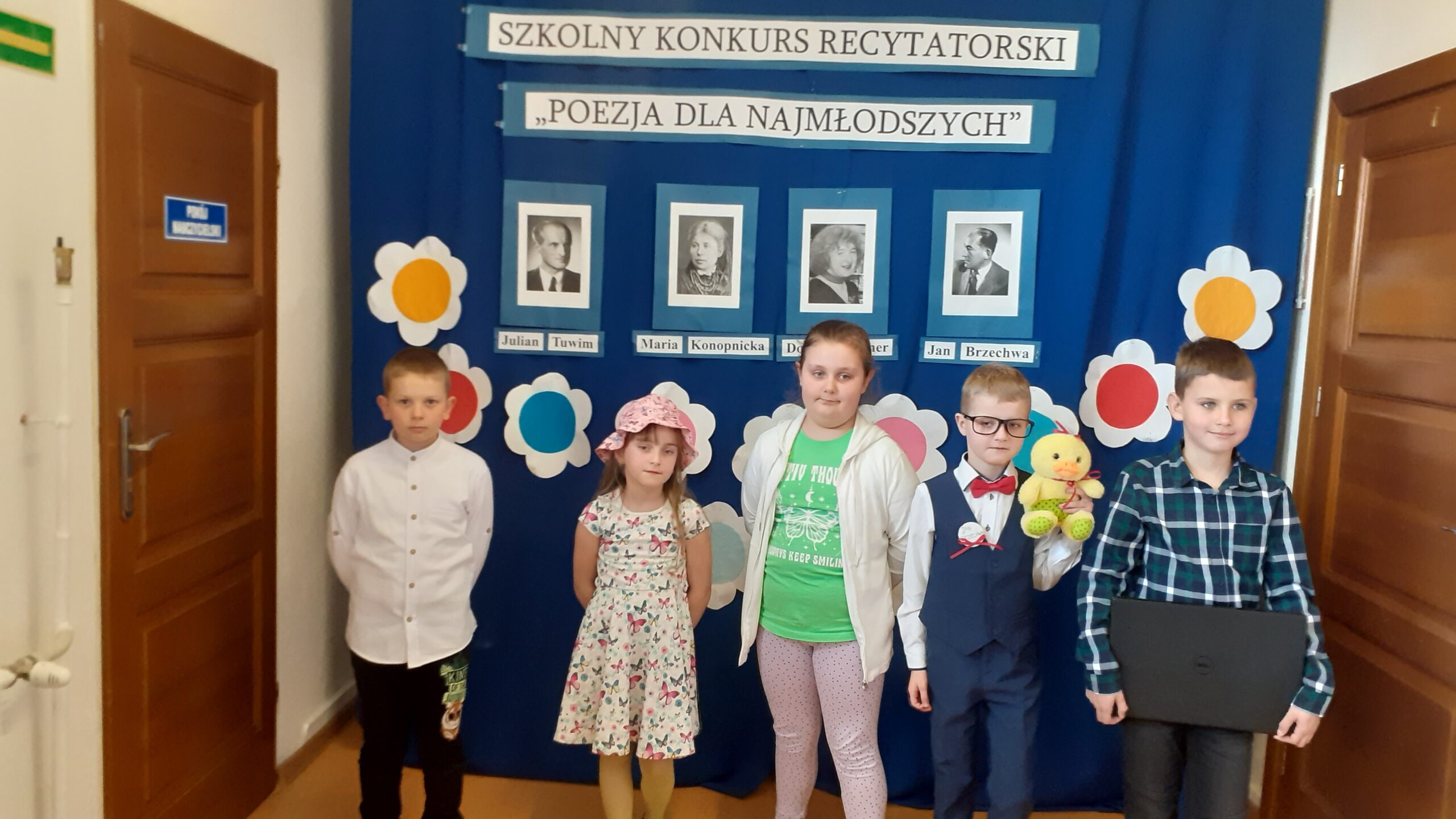 Dnia 19 marca 2024 roku odbył się Szkolny Konkurs Recytatorski – „ Poezja dla najmłodszych”.  Celem konkursu było poznanie twórczości wybitnych polskich poetów literatury dziecięcej, popularyzowanie piękna i kultury żywego słowa oraz rozwijanie zdolności recytatorskich. Konkurs cieszył się dużym zainteresowaniem, wzięło w nim udział trzynaścioro uczniów i sześcioro dzieci z oddziału przedszkolnego. Uczestnicy zaprezentowali swój kunszt recytatorski, a także  umiejętności nad którymi pilnie pracowali w ostatnim czasie.