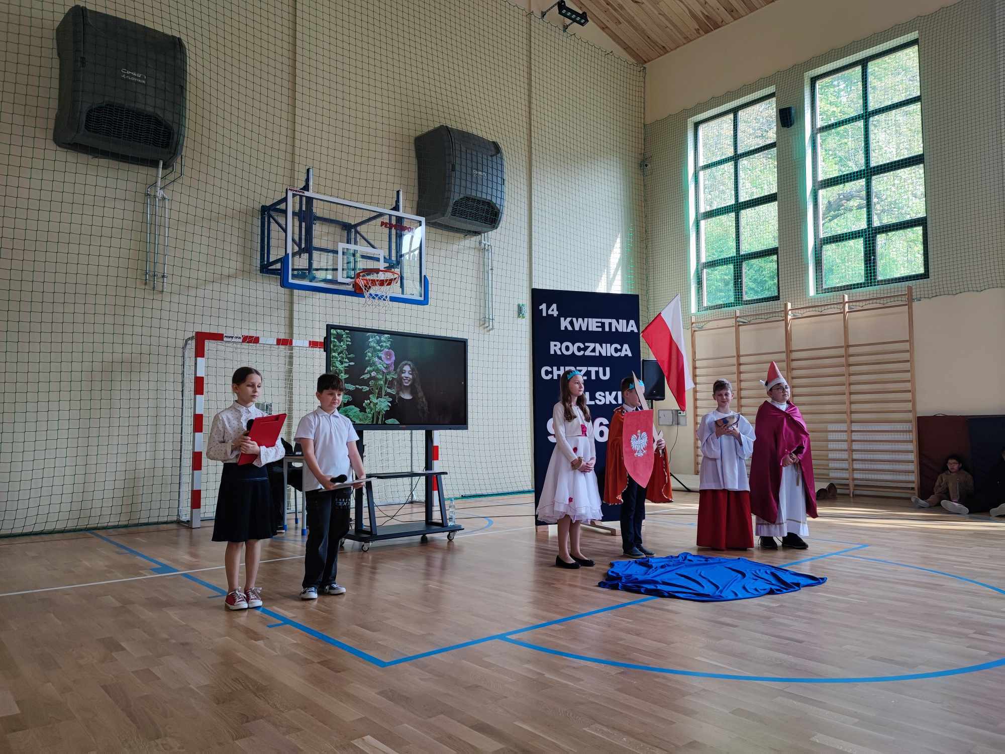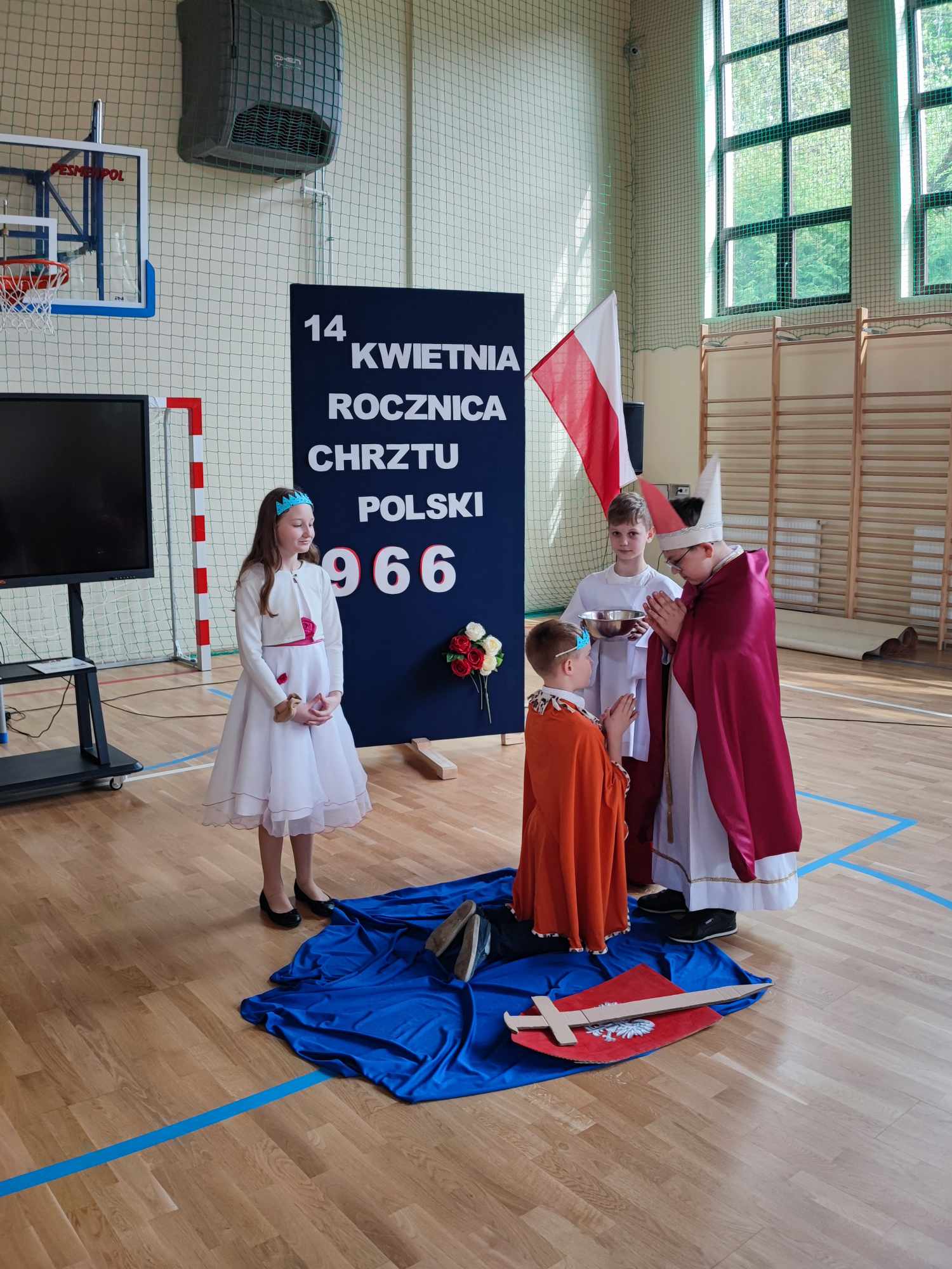15 kwietnia uczniowie klasy czwartej wraz z wychowawcą przygotowali krótki apel dotyczący kolejnej rocznicy Chrztu Polski. Pokrótce została przedstawiona historia naszej ojczyzny, a dokładnie rok 966, gdzie to Mieszko I przyjął chrzest i tym sposobem zapoczątkował chrystianizację naszego kraju. Dzięki scence odegranej przez uczniów wszyscy przenieśli się w odległe czasy i zostali zapoznani z następstwami chrystianizacji Polski. Zdjęcia uwieczniające uczestników apelu zostały wykonane za pomocą aparatu z programu #LaboratoriaPrzyszłości.