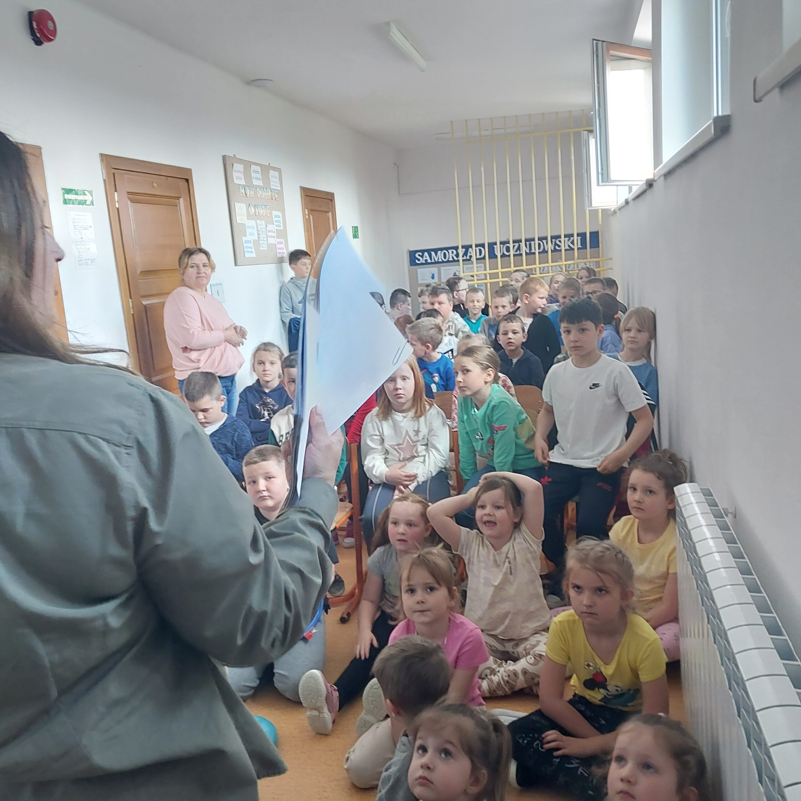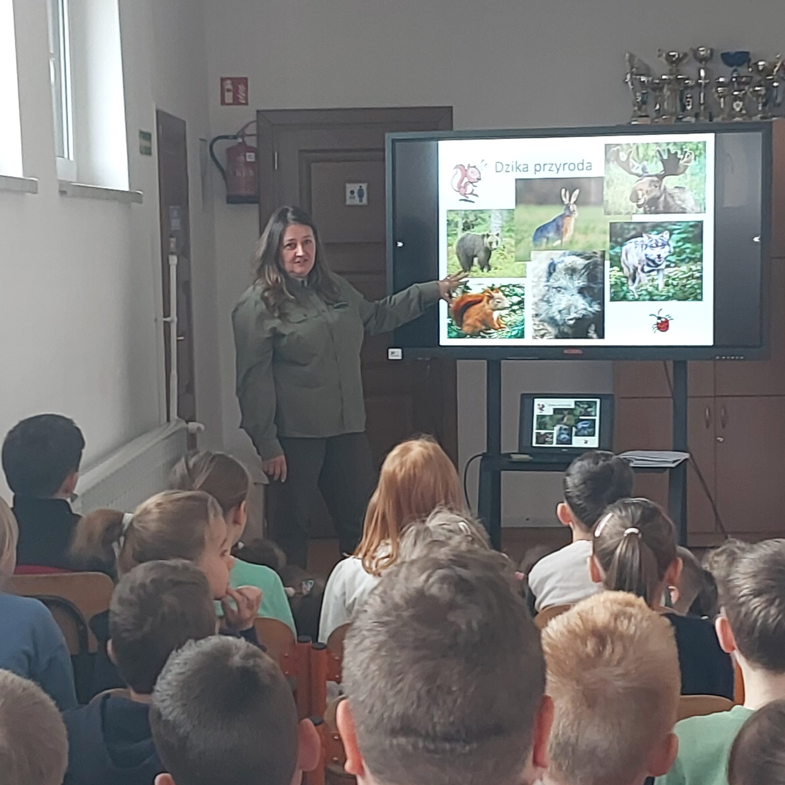 We wtorek, 23.04.2024 r. w naszej szkole odbyła się prelekcja z panią Agnieszką – leśnikiem z Nadleśnictwa w Starym Sączu. Celem spotkania było zapoznanie dzieci z oddziału przedszkolnego i I, II, III z pracą leśnika oraz kształtowanie podstawowych zasad ochrony przyrody. Prowadząca opowiedziała o swoim podstawowym obowiązku, jakim jest troska o las. Mówiła o zwierzętach i ptakach zamieszkujących to miejsce, o ich zwyczajach i potrzebach. Dzieci dowiedziały się, że człowiek jest gościem w lesie i musi szanować gospodarzy, czyli zwierzęta w nim mieszkające oraz nie niszczyć roślin. Przypomniały sobie i utrwaliły zasady zachowania się w lesie ( zachowanie ciszy, porządku, szanowanie drzew i roślin, unikanie kontaktu z dzikimi zwierzętami). Z zaciekawieniem poszerzały swoją wiedzę i postanowiły, że będą się starać pomagać zwierzętom i ptakom przetrwać zimę oraz dbać o swoją zieloną planetę. Wszyscy aktywnie uczestniczyli w zajęciach dzieląc się spostrzeżeniami i posiadaną wiedzą. Na koniec spotkania dzieci otrzymały malowanki i książeczki dotyczące ochrony przyrody.
