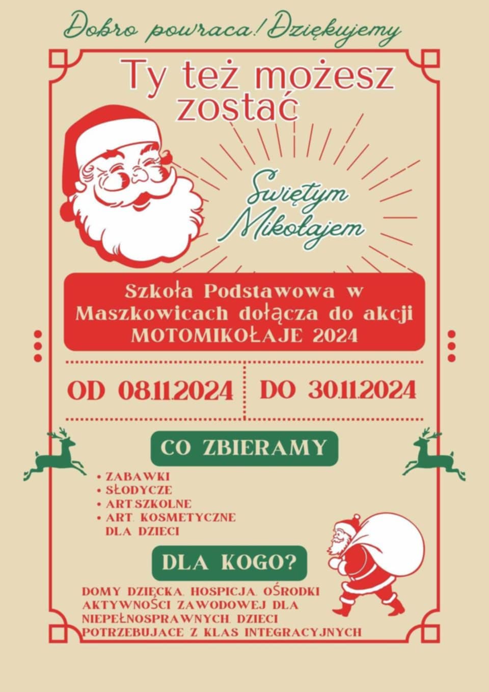 Zbiórka trwa do 30 LISTOPADA– przyniesione dary zostawiamy w specjalnie oznakowanym miejscu🧺 🎅 Razem możemy odmienić życie wielu dzieci! Każdy najmniejszy gest ma wielką moc, więc dołącz do nas i podziel się dobrem! ❤️