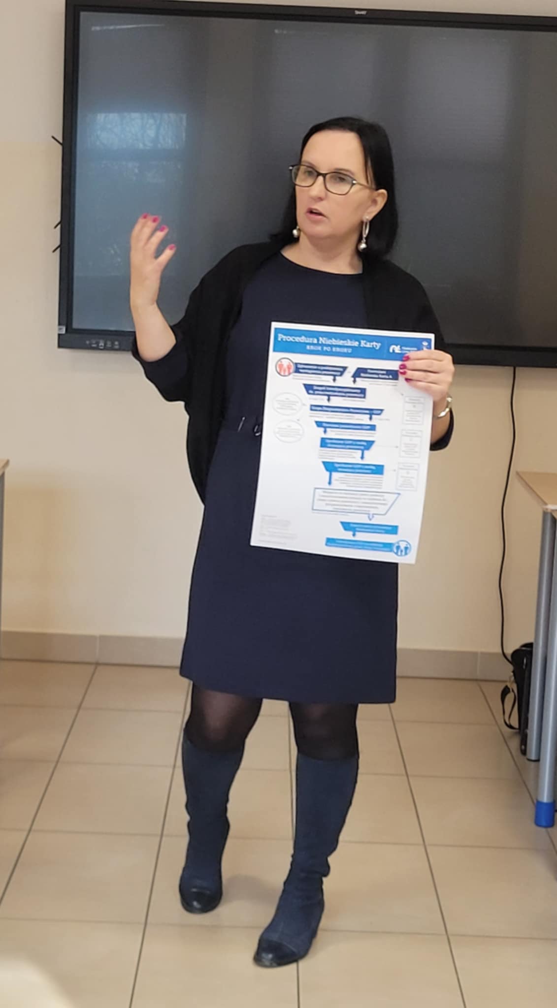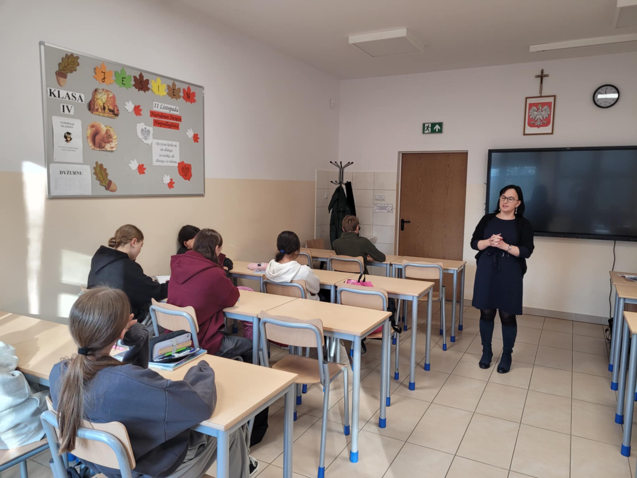 Prelekcja dotyczyła problemu przemocy domowej i procedury Niebieskiej Karty. Pani Marysia jest interwentem kryzysowym i psychologiem w naszej szkole. Pomaga również osobom przeżywającym różne kryzysy związane z jakimś wydarzeniem traumatycznym. Udzielała dzisiaj informacji odnośnie przemocy, procedury Niebieskiej Karty i Standardów Ochrony Małoletnich.