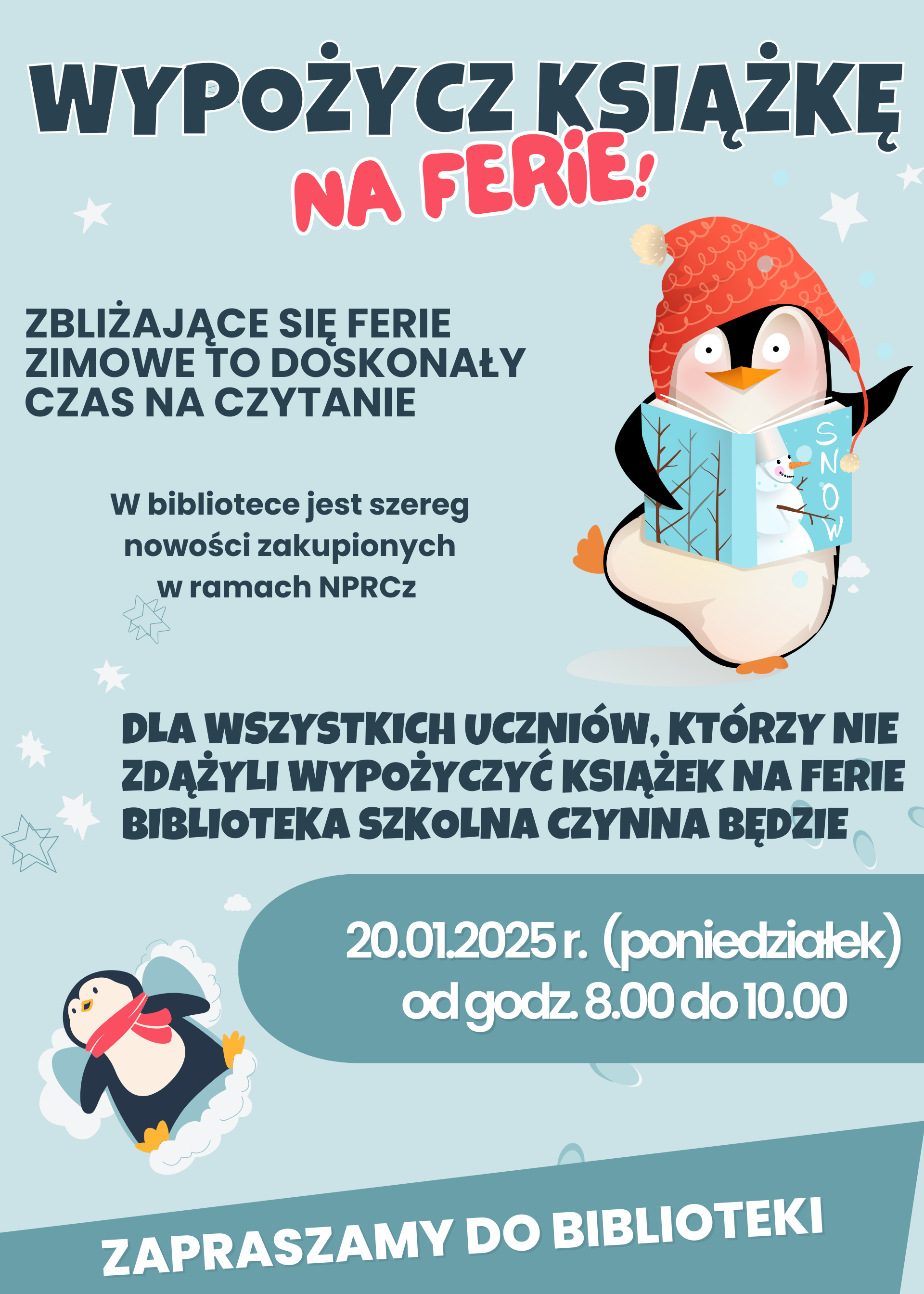 INFORMACJA BIBLIOTECZNA – ZWIĄZANA Z WYPOŻYCZANIEM KSIĄŻEK NA OKRES FERII