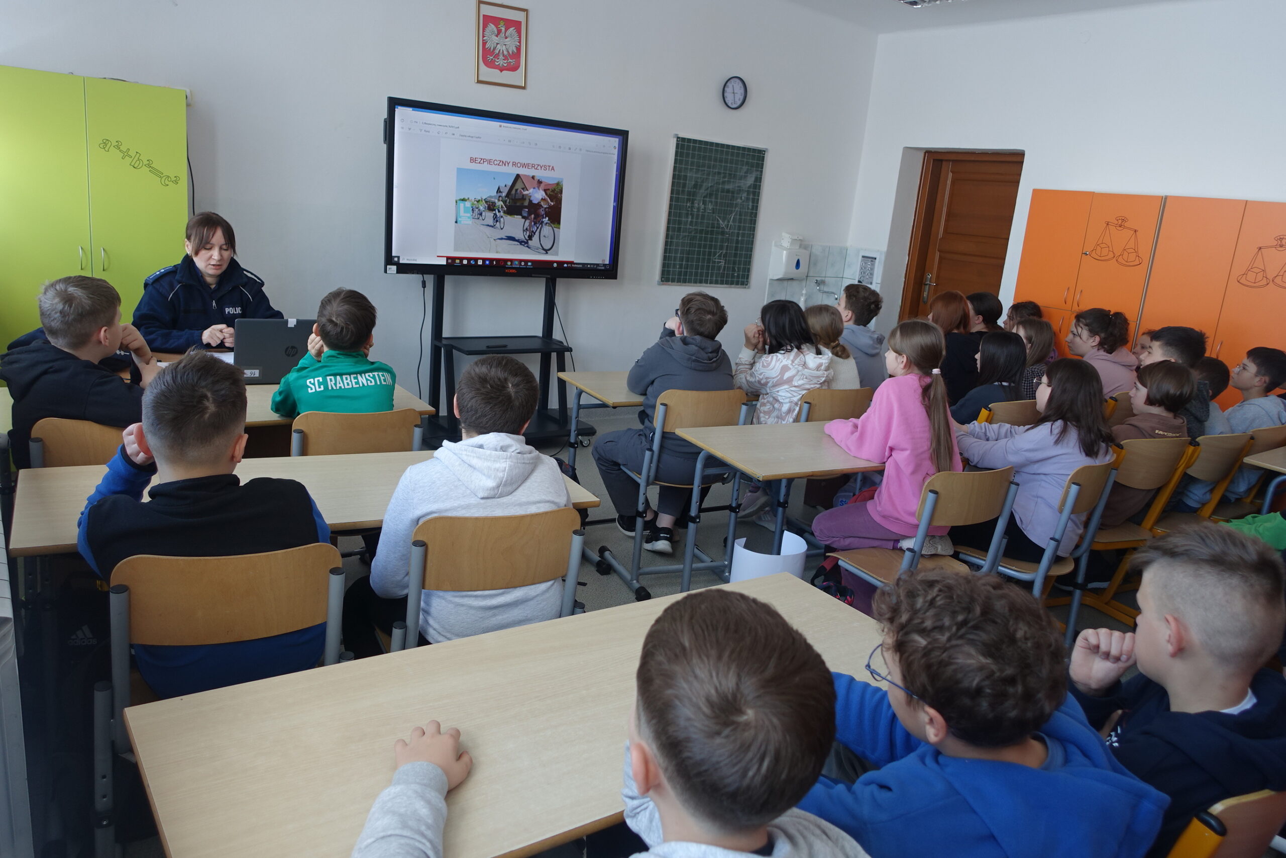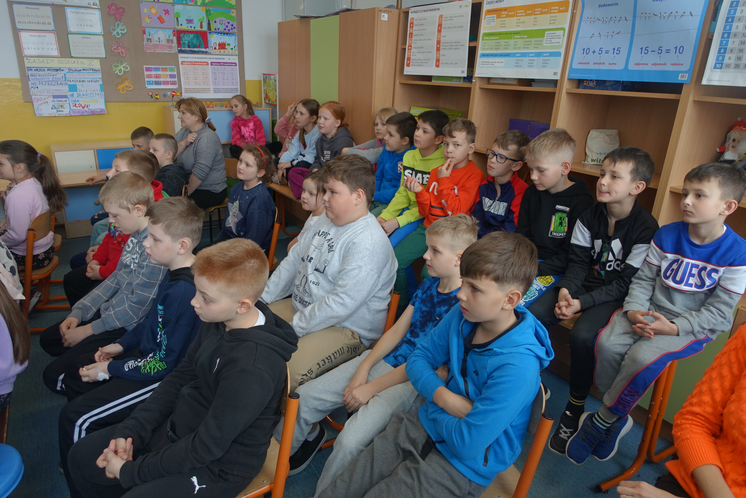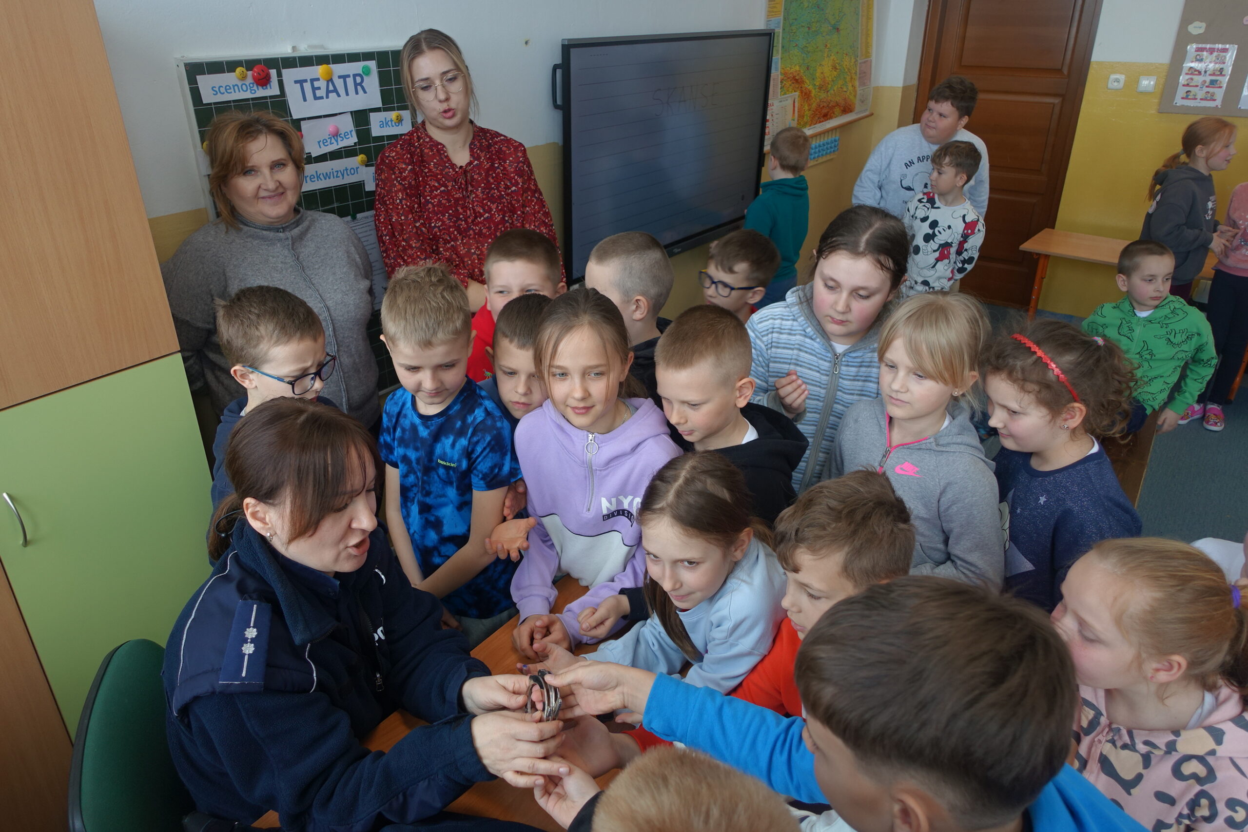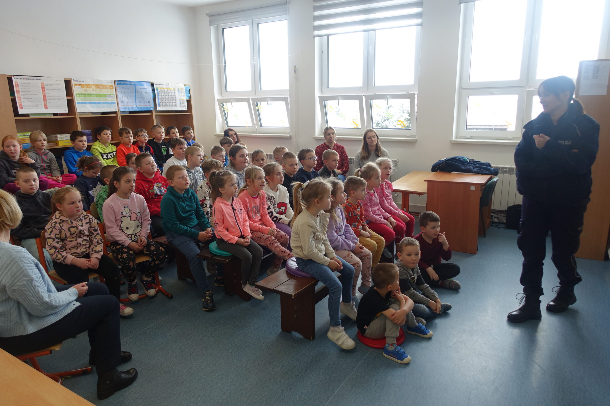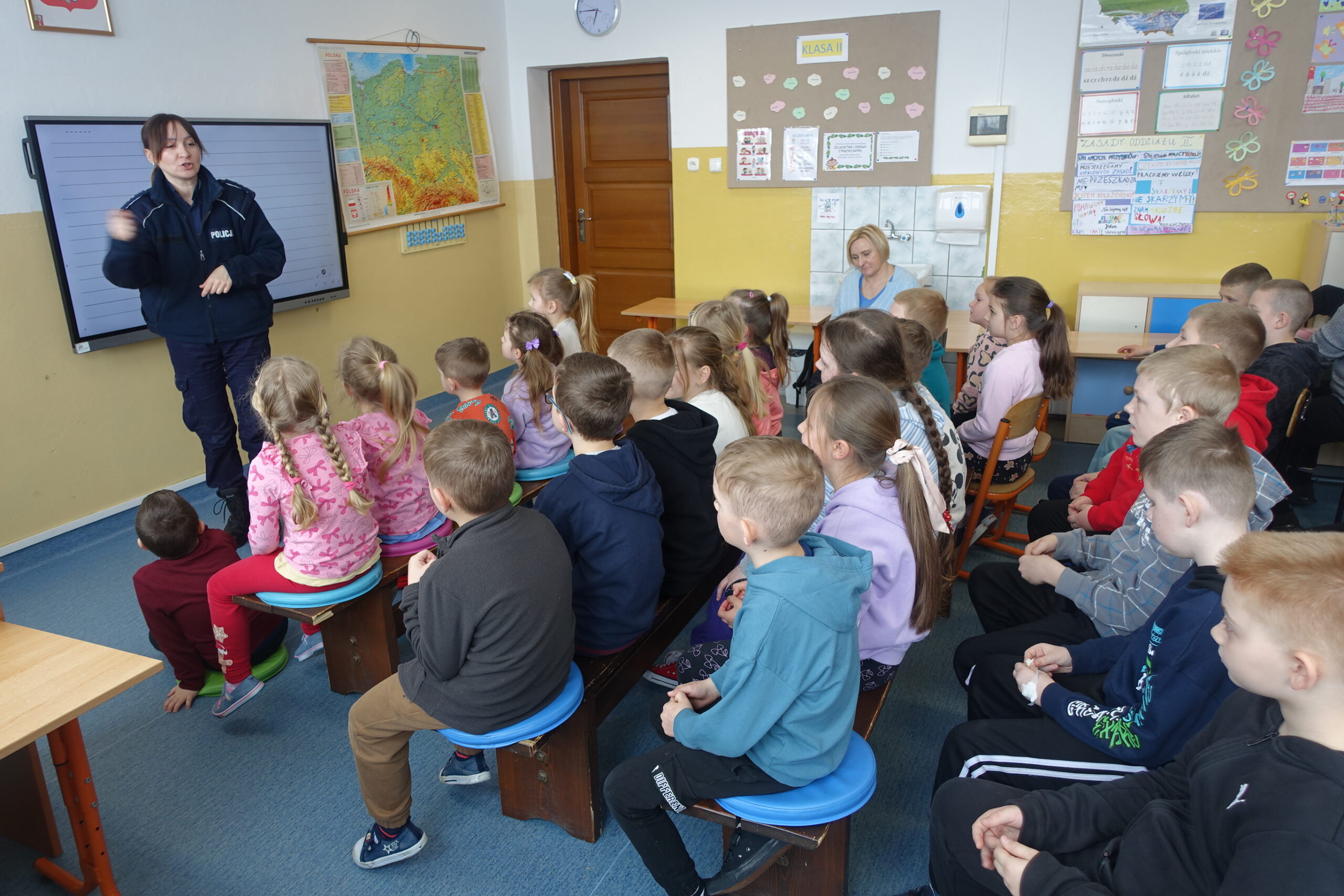 W dniu 17 marca 2025 r. odbyło się spotkanie przedszkolaków, uczniów klas I–III oraz IV-VII z funkcjonariuszką Policji asp. Edytą Bołoz w ramach działań profilaktyczno-edukacyjnych oraz orientacji zawodowej. Celem prelekcji było przypomnienie uczniom o zasadach bezpiecznego poruszania się pieszo, rowerem oraz hulajnogą elektryczną. Ponadto uświadomiono uczniów klas IV- VII o zagrożeniach w sieci oraz zjawisku cyberprzemocy. Dodatkowo uczniowie zostali zapoznani z czynnościami jakie wykonuje w swoim zawodzie policjant. Najmłodsi z zaciekawieniem oglądali elementy ubioru i wyposażenie funkcjonariuszki.