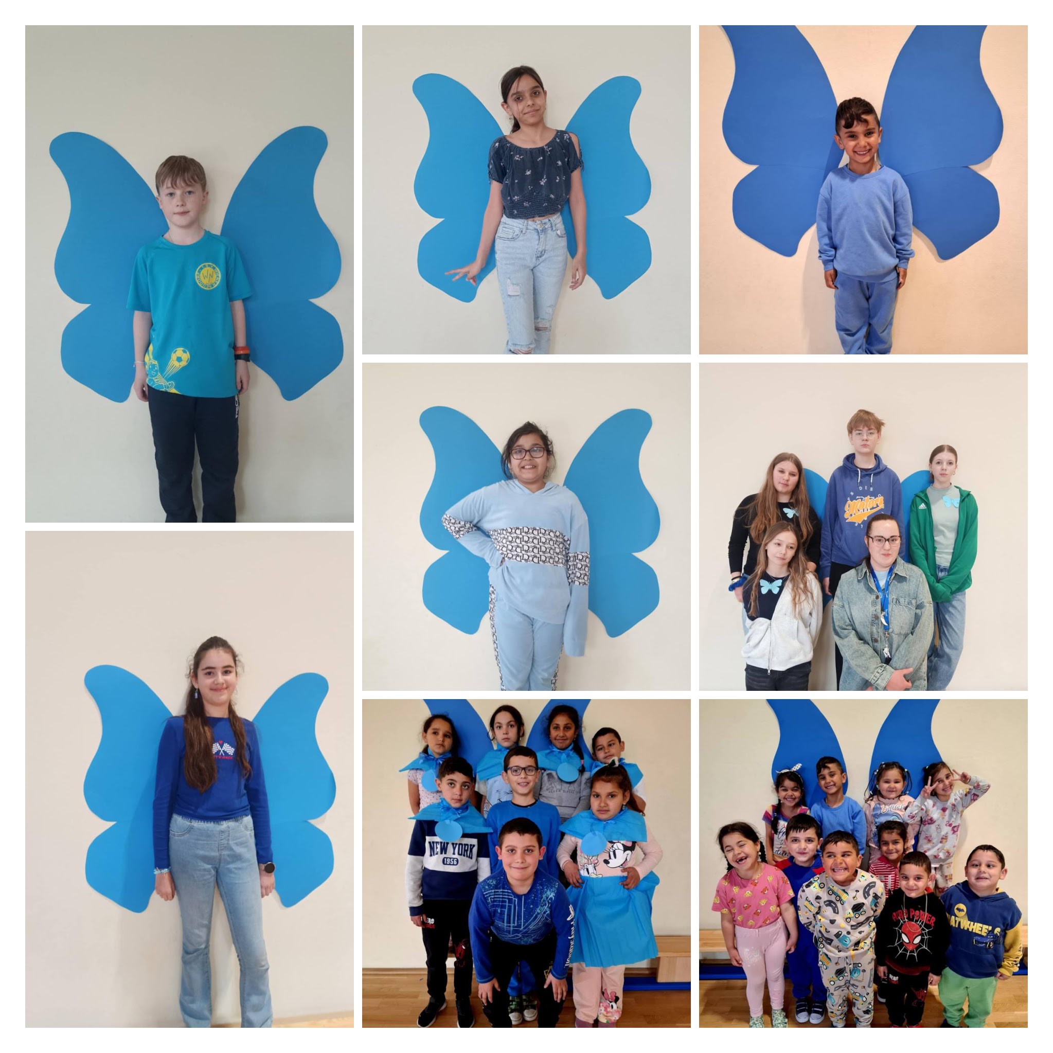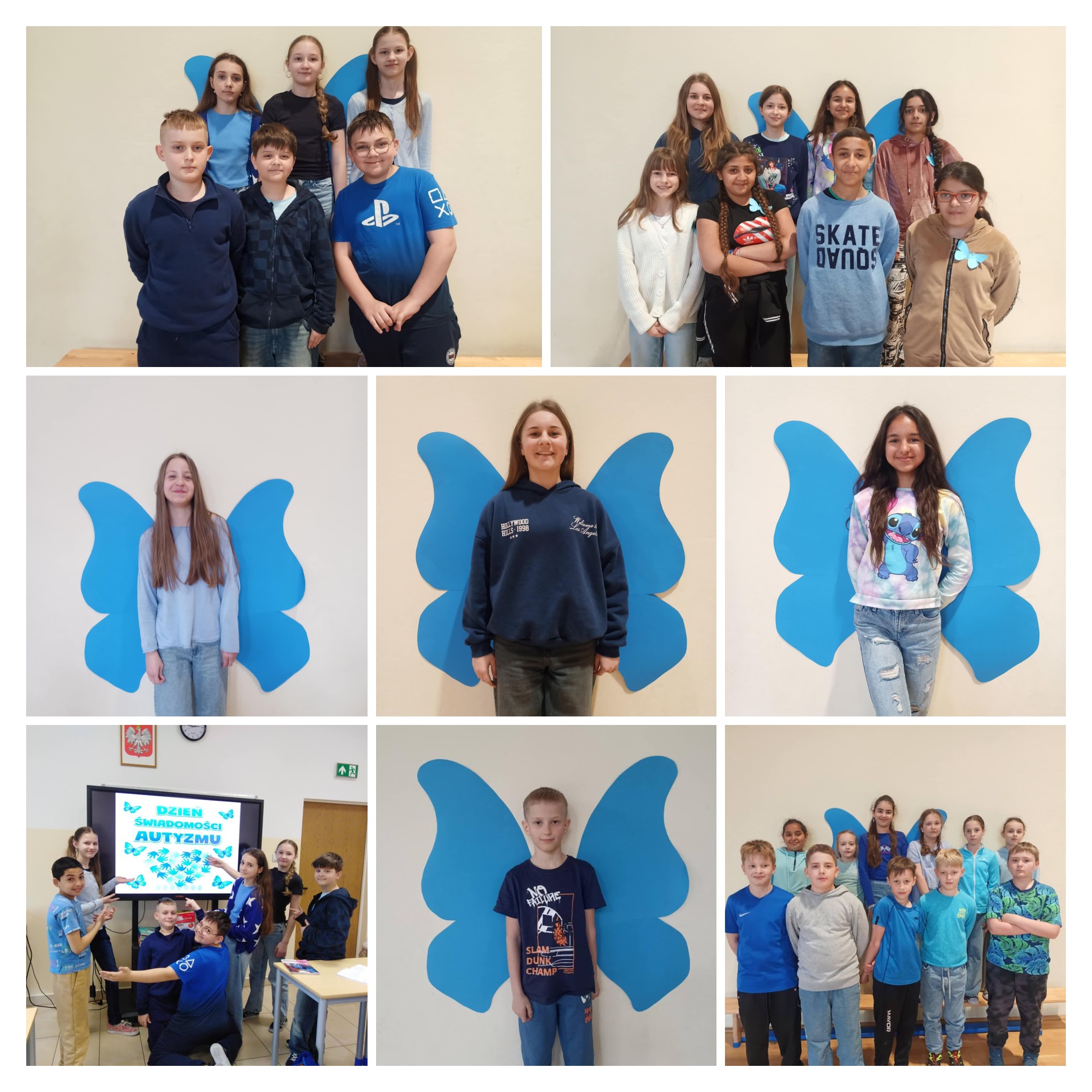 Nie zabrakło także jednego z symboli Światowego Dnia Świadomości Autyzmu – niebieskich skrzydeł motyla – na tle którego chętni uczniowie mogli wykonać sobie zdjęcie.