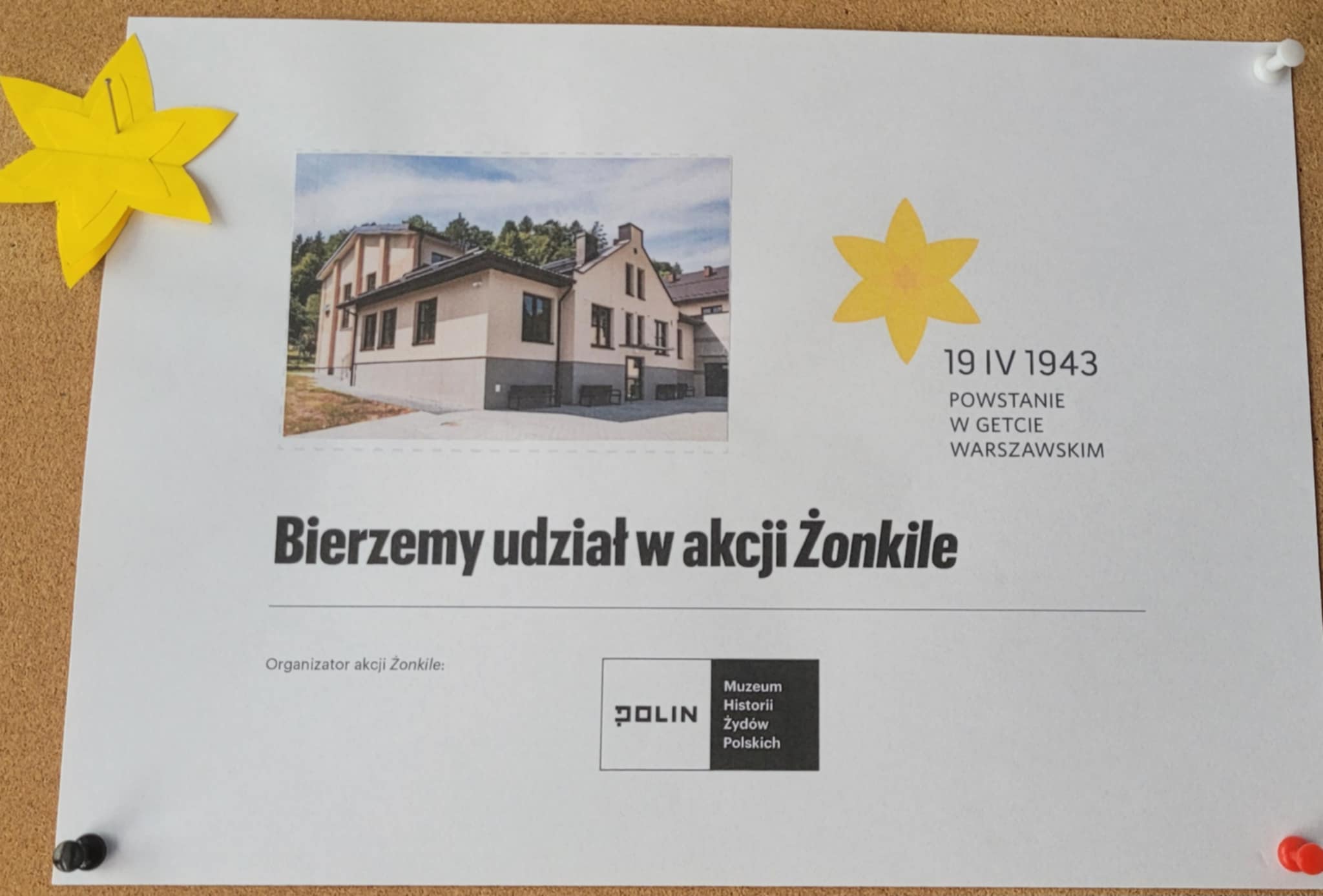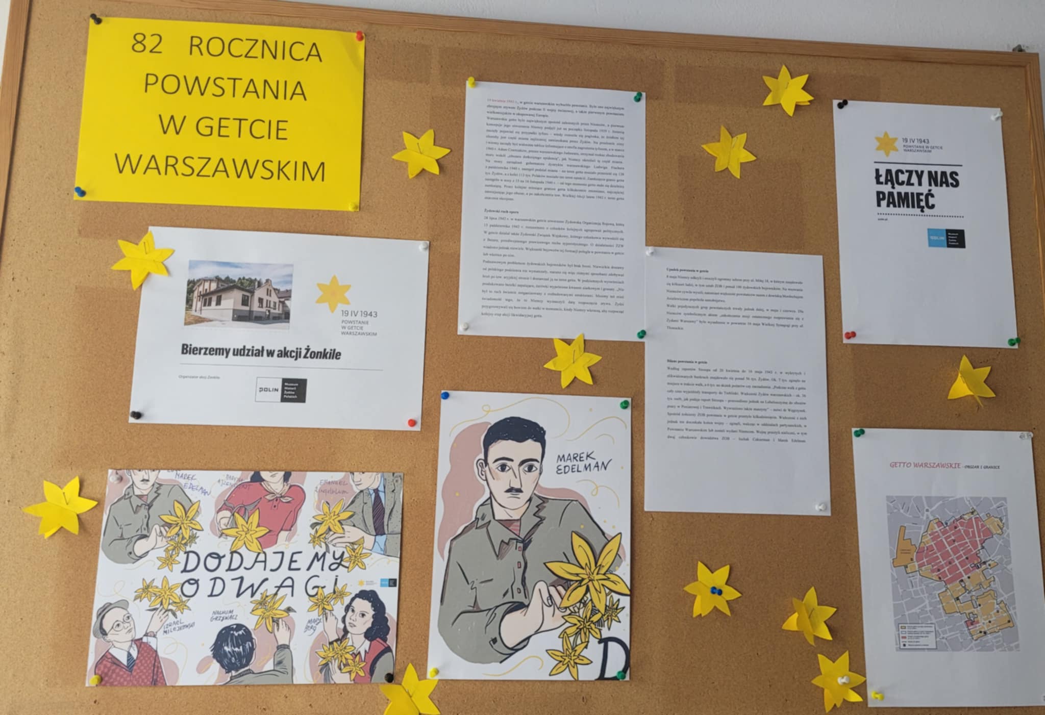 19 kwietnia przypadała już 82 rocznica wybuchu powstania w getcie warszawskim. Była to bohaterska zbrojna walka Żydów podczas II wojny światowej. Uczniowie klasy 8 na lekcji wos we współpracy z Muzeum Historii Żydów Polskich POLIN wzięli udział po raz pierwszy w akcji społeczno- edukacyjnej „Żonkile”. Hasłem tegorocznej akcji jest ODWAGA. Młodzież zapoznała się z historią powstania w getcie warszawskim widzianej oczami jej świadka Marka Edelmana przedstawionej w reportażu „Zdążyć przed Panem Bogiem” autorstwa Hanny Krall.