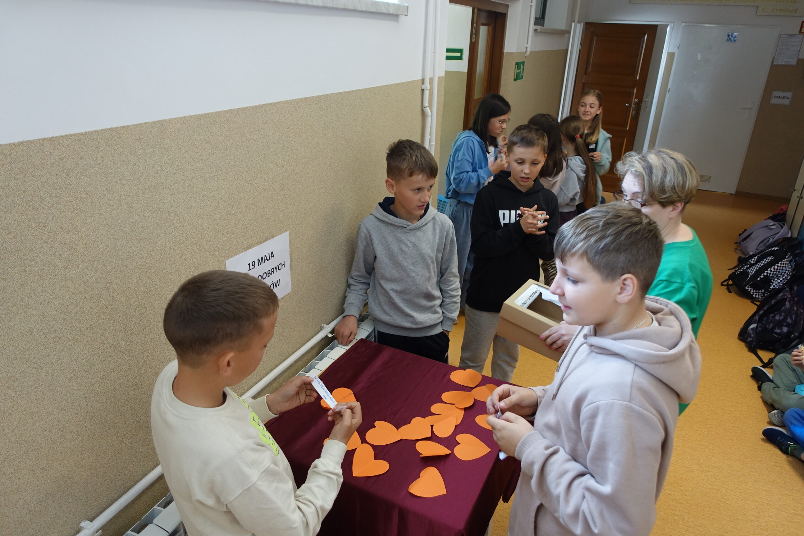 Z tej okazji uczniowie losowali karteczki z opisem dobrych uczynków, które mieli wykonać w ciągu dnia. Były to różnorodne zadania, od tych najprostszych, jak uśmiechnięcie się do kolegi, czy posprzątanie po sobie, po bardziej wymagające, np.: pomoc nauczycielowi, porozmawianie z kimś kogo się mniej lubi, itp.