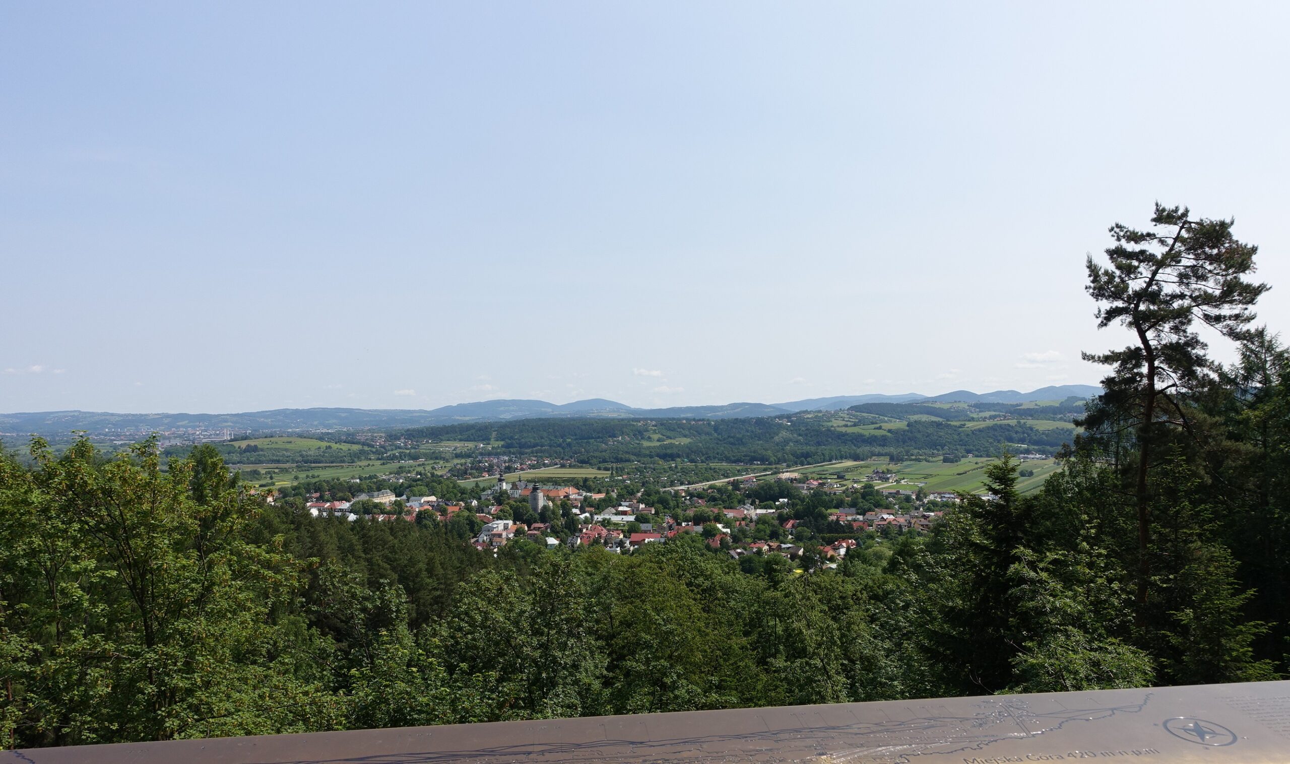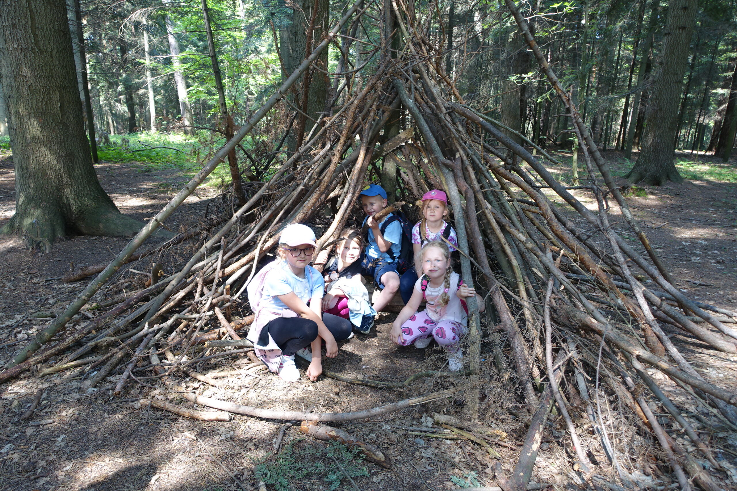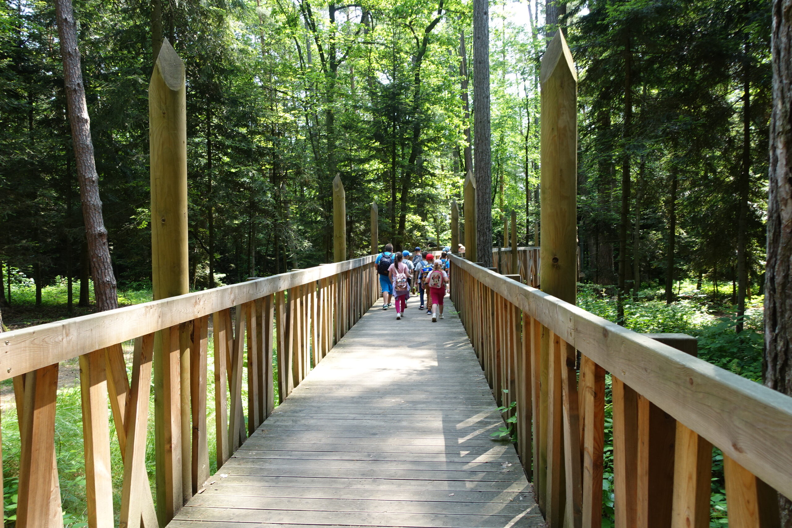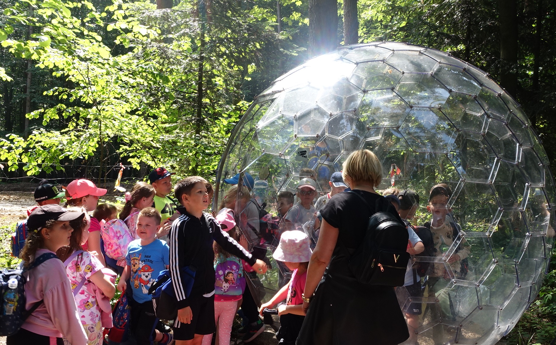 Następnie udaliśmy się do Starego Sącza, gdzie znajduje się Leśne Molo na Miejskiej Górze. Po drodze towarzyszyła nam ścieżka edukacyjna Krople Rosy, na której poznaliśmy cykl życia kumaka górskiego. Wszystkie dzieci w bardzo dobrym tempie dotarły na Miejską Górę, która ma wysokość 420 m n.p.m. Dzieciom bardzo podobał się spacer w koronach drzew oraz podziwianie panoramy Starego Sącza.