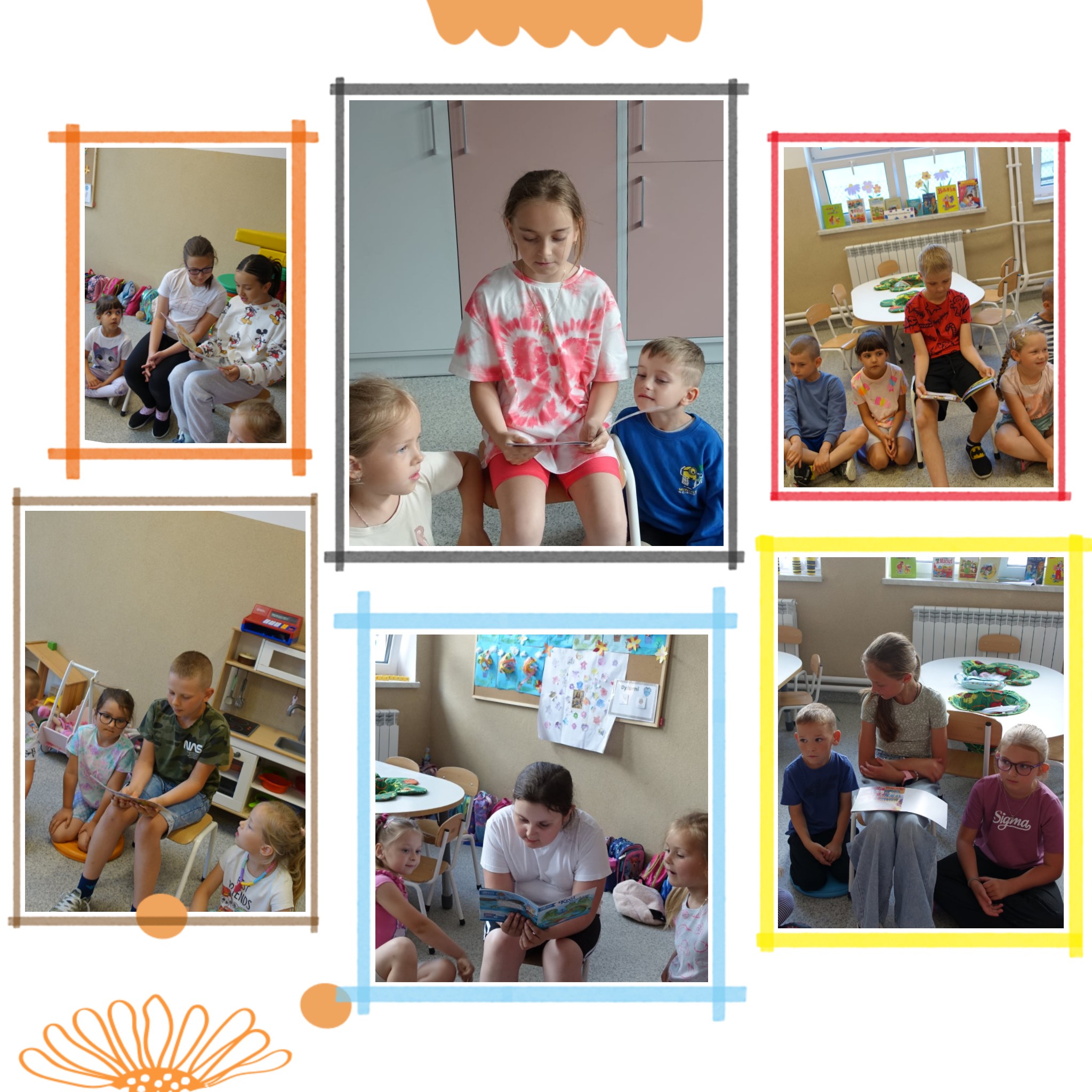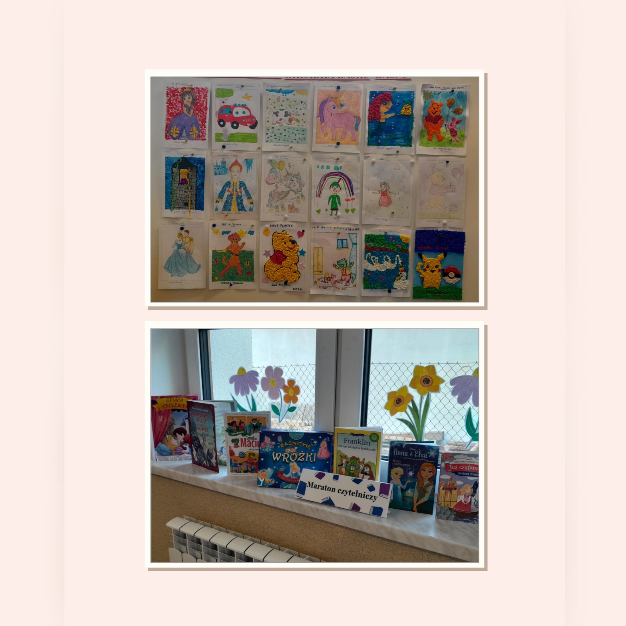 W naszym oddziale przedszkolnym od 12 maja do 25 czerwca zrealizowana została akcja o charakterze innowacyjnym pod hasłem „Maraton czytelniczy”. Celem nadrzędnym owych działań było rozbudzanie wśród najmłodszych zainteresowania literaturą dziecięcą, rozwijanie wyobraźni, a także budowanie więzi rodzinnych poprzez wspólne czytanie. Do inicjatywy tej aktywnie zaangażowani byli starsi uczniowie klas, nauczyciele oraz rodzice przedszkolaków.  Przez kilka tygodni, podczas zajęć czytelniczych, dzieci miały okazję wysłuchać bajek i baśni, omawiać naukę z nich płynącą oraz wykonywać do nich piękne ilustracje. Jednym z działań była także współpraca z nauczycielem biblioteki, który dwukrotnie zaprosił przedszkolaków na zajęcia biblioteczne. Codzienne spotkania z literaturą odbywały się w przyjaznej atmosferze, sprzyjającej skupieniu i rozwijaniu pasji do książek. Kulminacyjnym punktem akcji był rodzinny konkurs plastyczno-techniczny na „Najpiękniejszą okładkę bajki lub baśni”. Zadaniem uczestników było stworzenie oryginalnej i kreatywnej okładki inspirowanej wybraną bajką, baśnią z bogatego kanonu literatury dziecięcej.  Prace cechowały się ogromną pomysłowością, estetyką wykonania oraz różnorodnością wykorzystanych technik. Konkurs spotkał się z dużym zainteresowaniem i zaangażowaniem ze strony rodzin, ponieważ wpłynęło aż 18 prac, a  każda z nich była efektem wspólnej twórczości dzieci i ich bliskich. Dzięki tej inicjatywie dzieci nie tylko poznały wiele ciekawych opowieści, rozwinęły umiejętność słuchania ze zrozumieniem,