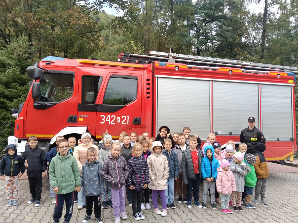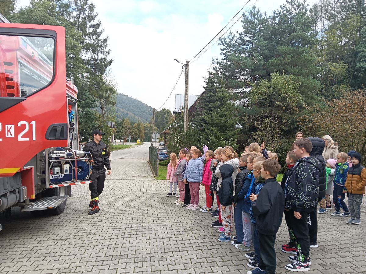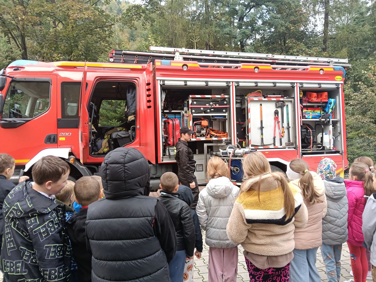 Dodatkowo uczniowie klas 0–III mieli okazję obejrzeć z bliska samochód strażacki oraz sprzęt używany podczas akcji ratowniczych. Spotkanie to cieszyło się dużym zainteresowaniem i miało charakter edukacyjny – dzieci mogły zadawać pytania i dowiedzieć się więcej o pracy strażaków.