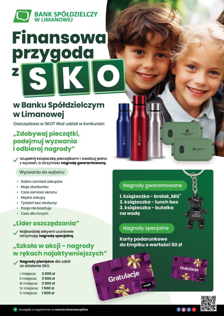 W tym roku szkolnym w naszej szkole rozpoczyna działalność Szkolna Kasa Oszczędzania SKO pod patronatem #Banku Spółdzielczego w Limanowej. Serdecznie zapraszamy do współpracy i oszczędzania. Więcej informacji można uzyskać u Pani Marii Olchawy