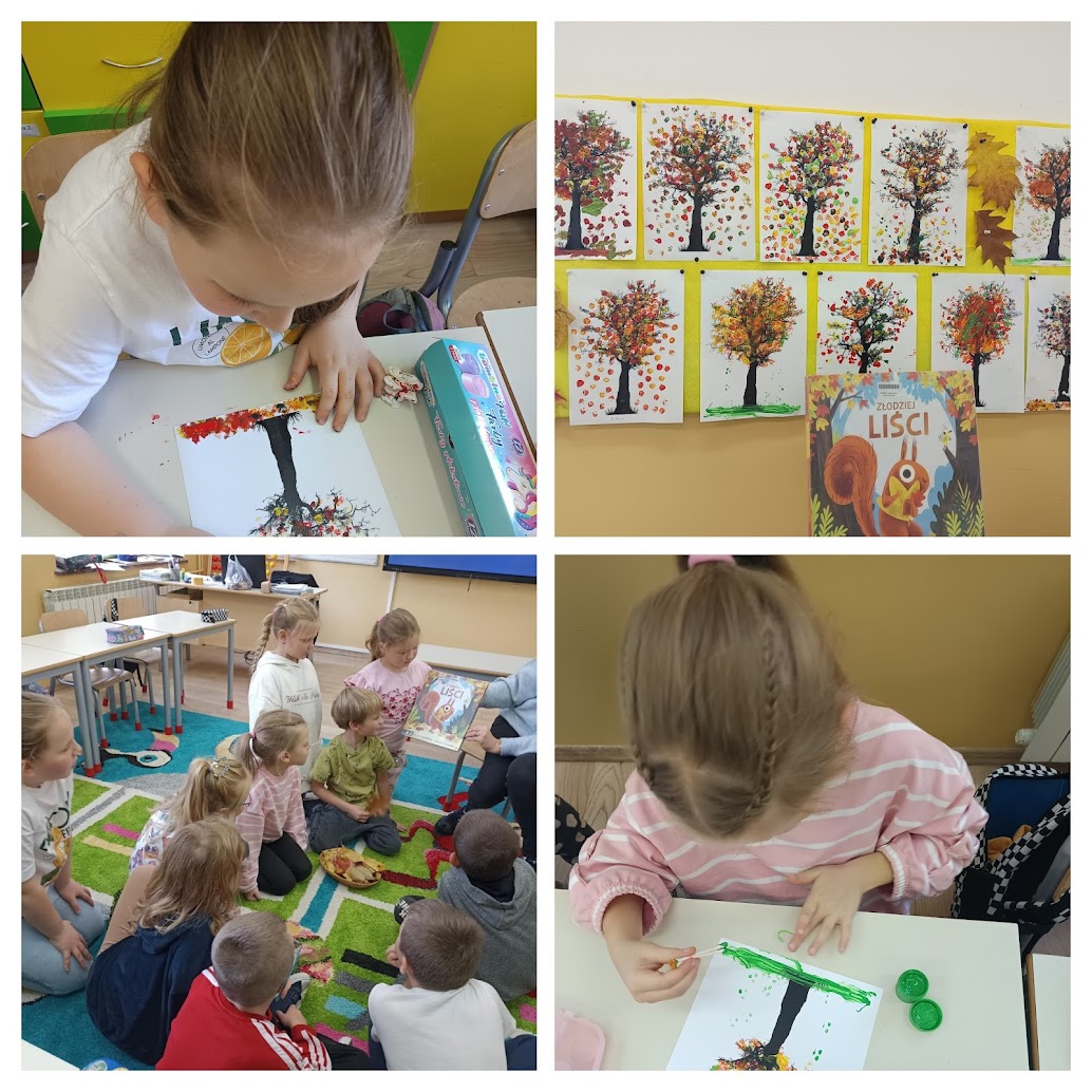 W części plastycznej uczestnicy stworzyli jesienne drzewka metodą kropkowania – przy użyciu patyczków higienicznych nanosili farbę na szablon drzewa, tworząc barwne, jesienne korony. Zajęcia przebiegły w radosnej i twórczej atmosferze, a dzieci z dumą prezentowały swoje prace. Zajęcia były doskonałym wprowadzeniem do cyklu spotkań, podczas których dzieci będą odkrywać uroki każdej pory roku poprzez literaturę i sztukę.