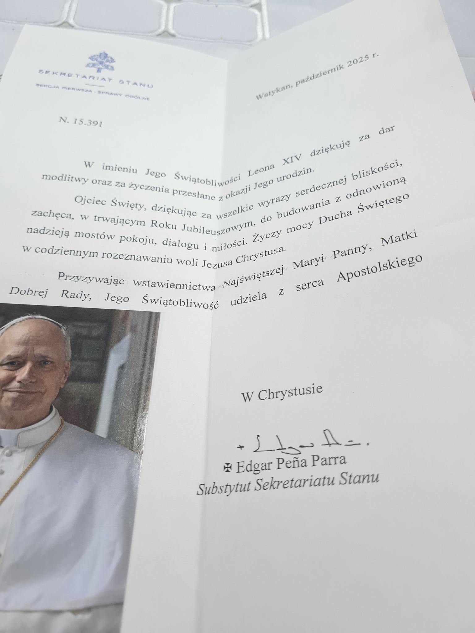Kolejna radosna wiadomość! Uczniowie klasy 8b pod kierunkiem nauczycielki języka angielskiego Pani Beaty Bulandy złożyli życzenia urodzinowe Jego Świątobliwości Papieżowi Leonowi XIV. Dzisiaj otrzymaliśmy list z Watykanu, piękne podziękowania i Apostolskie Błogosławieństwo.