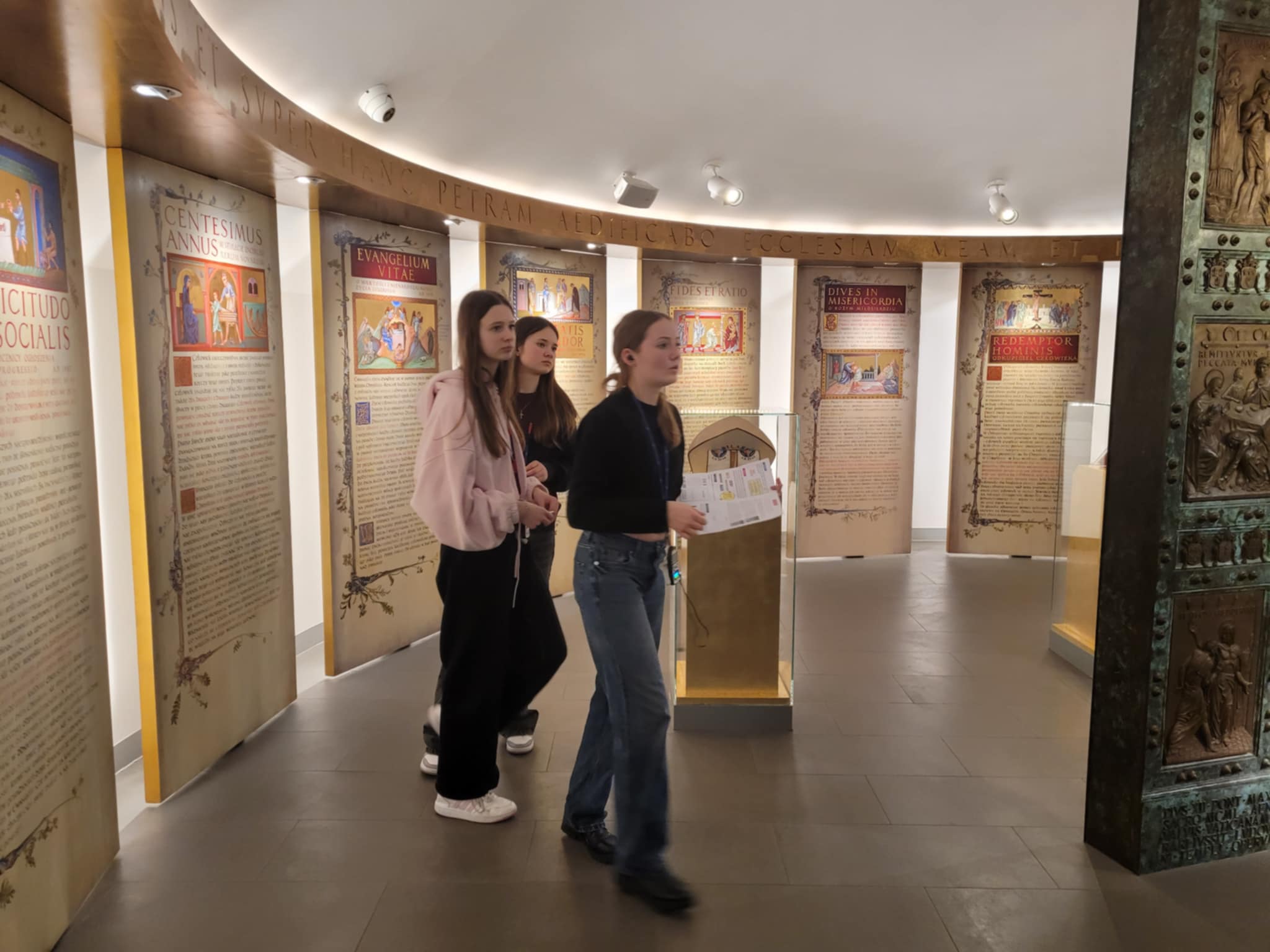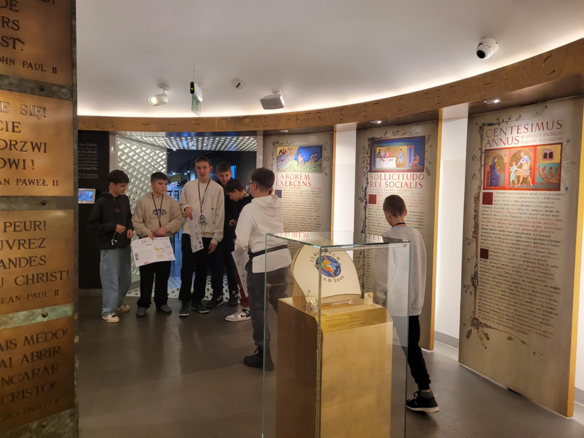 Po tej trudnej, ale ważnej lekcji historii, uczestnicy wyjazdu udali się do Wadowic – rodzinnego miasta Karola Wojtyły, znanego światu jako papież Jan Paweł II. Głównym punktem zwiedzania było Muzeum – Dom Rodzinny Jana Pawła II, mieszczące się w kamienicy, gdzie przyszły papież spędził swoje dzieciństwo i młodość. Nowoczesna ekspozycja muzeum, wzbogacona o multimedia, archiwalne zdjęcia i osobiste pamiątki papieża, pozwoliła uczniom poznać nie tylko biografię św. Jana Pawła II, ale również wartości, którymi się kierował: miłość, dialog, pokój i troska o drugiego człowieka. Wielu uczniów z zainteresowaniem śledziło losy młodego Karola – ucznia, sportowca, aktora i późniejszego duchownego, aż po moment wyboru na papieża.Uczniowie zwiedzili ponadto Bazylikę.