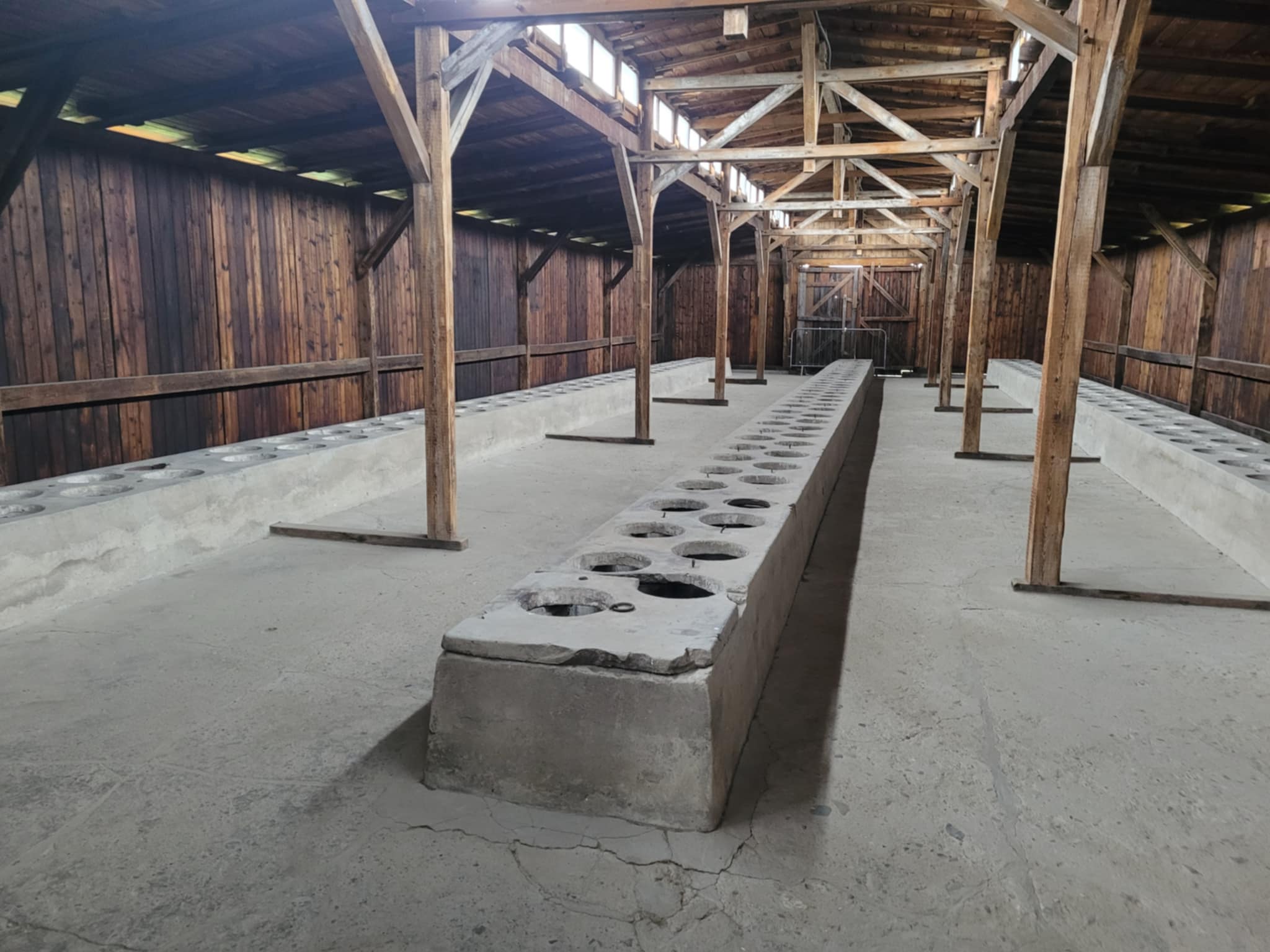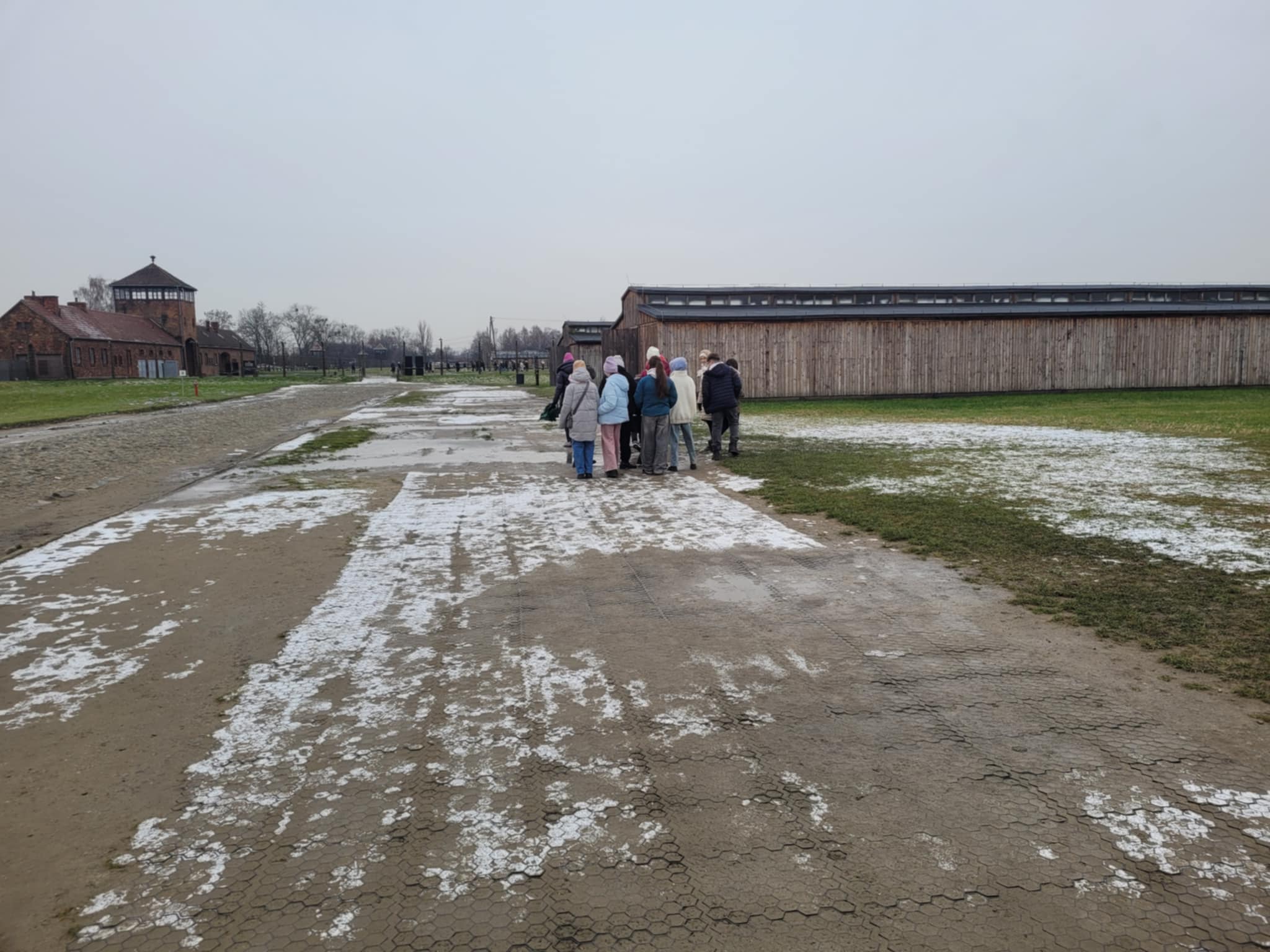 Pierwszym punktem programu było zwiedzanie byłego niemieckiego nazistowskiego obozu koncentracyjnego i zagłady Auschwitz-Birkenau. Uczniowie w nostalgii i ciszy przemierzali kolejne części muzeum: baraki, rampę kolejową, komory gazowe oraz zachowane fragmenty ogrodzeń i dróg. Przewodnik w ciekawy i bardzo poruszający sposób opowiadał o losach więźniów, codziennym życiu w obozie i mechanizmach funkcjonowania tego przerażającego miejsca. Szczególne wrażenie zrobiła część wystawy przedstawiająca rzeczy osobiste ofiar – walizki, buty, okulary i fotografie rodzinne. Uczniowie utwierdzili w sobie przekonanie, że takiej zbrodni nie wolno nigdy zapomnieć ani też powtórzyć.