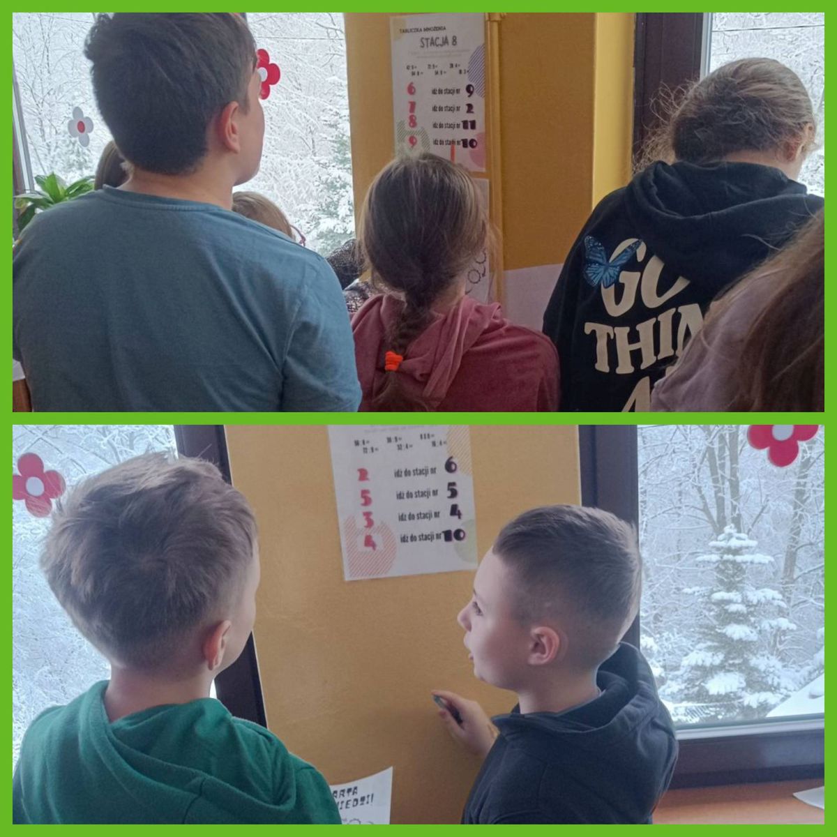 W dniu obchodów na korytarzach szkolnych pojawiły się stacje zadaniowe, które wymagały od uczniów skupienia i logicznego myślenia. Każdy chętny uczestnik otrzymywał specjalnie przygotowaną kartę, na której zaznaczał kolejne wykonane zadania. Po ukończeniu wszystkich stacji karty były wrzucane do oznaczonego pudełka. Stacje miały na celu wyłonienie Mistrza Tabliczki Mnożenia. Jeśli w danej klasie kilka osób uzyskało taką samą liczbę punktów, organizowana była dogrywka, polegająca na jak najszybszym udzieleniu poprawnych odpowiedzi z tabliczki mnożenia.
