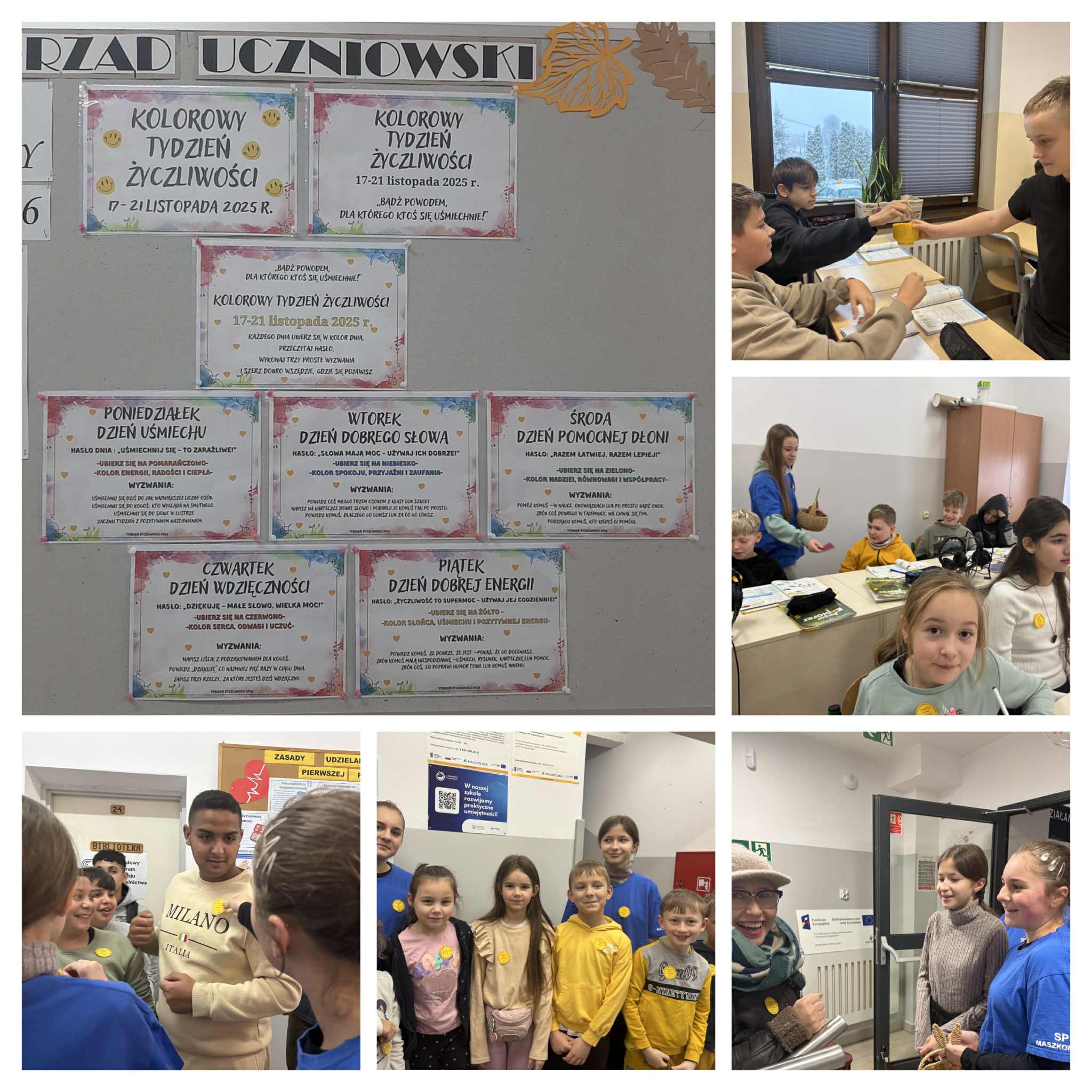 W ostatnim dniu już od samego rana na wszystkich wchodzących do szkoły czekała niespodzianka — uczniowie rozdawali życzliwe emblematy, które wywoływały uśmiechy od progu. W klasach pojawiły się z kolei życzliwe myśli i sentencje, a każdy uczeń miał za zadanie napisać coś miłego dla kolegi lub koleżanki.