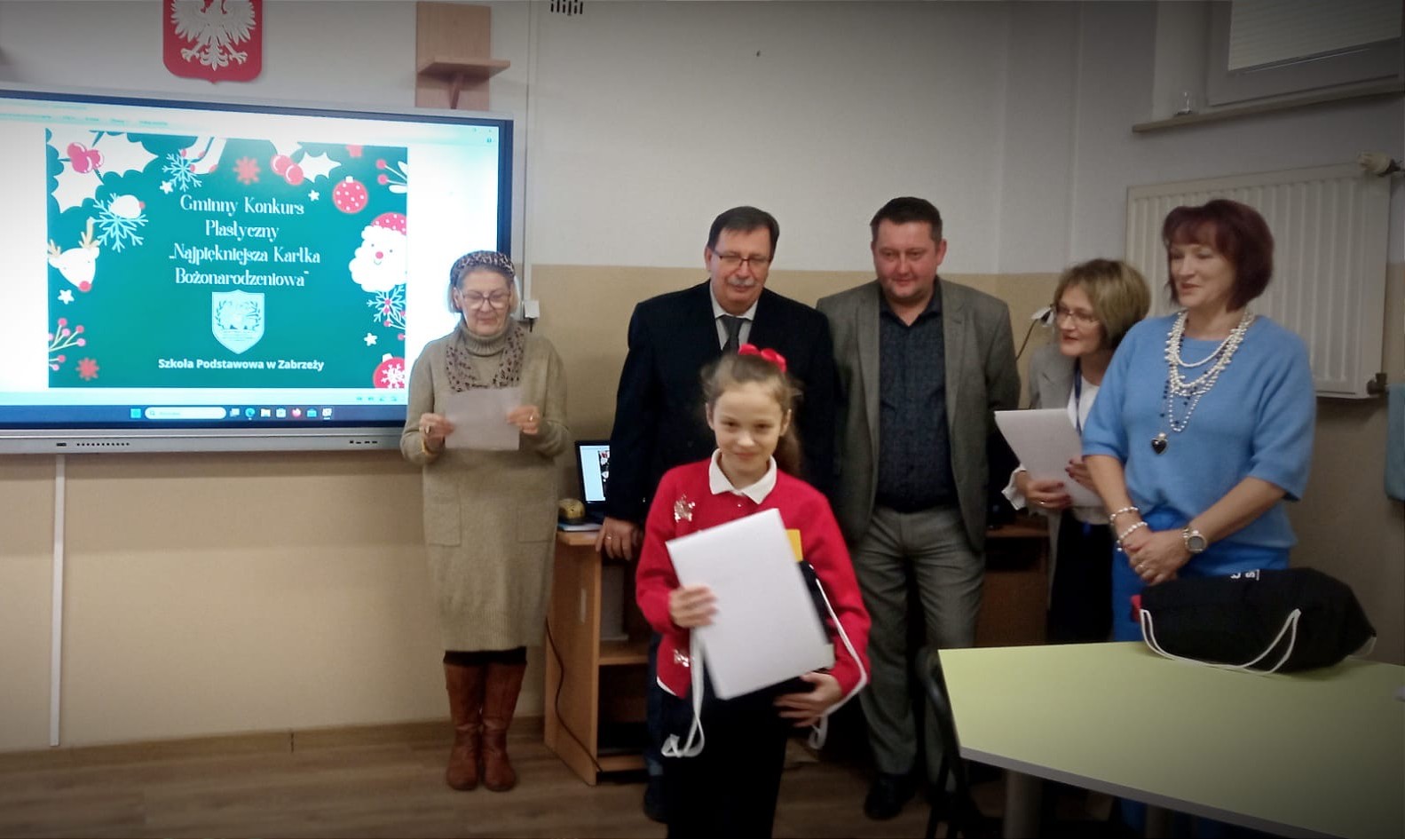 W dniu 17 grudnia w Szkole Podstawowej w Zabrzeży odbył się  Gminny Konkurs Plastyczny klas I-III „Najpiękniejsza Kartka Bożonarodzeniowa”.  Zadaniem uczestników było samodzielne wykonanie pastelami olejnymi kartki świątecznej. Naszą szkołę reprezentowała Alicja Tokarczyk,  uczennica kl. III, która zdobyła II miejsce.