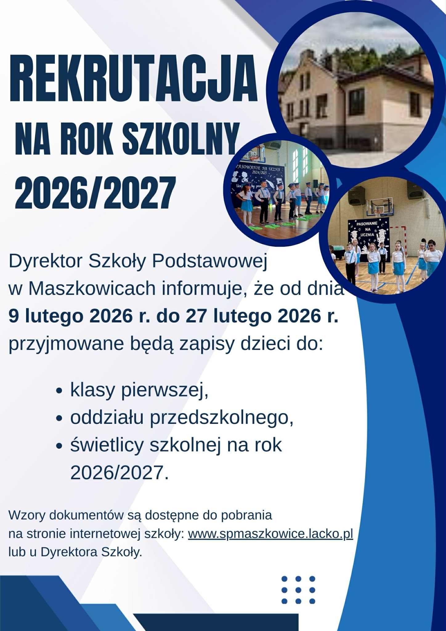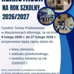 Dyrektor Szkoły Podstawowej Maszkowicach informuje, że od 9 lutego 2026 r. do 27 lutego 2026r. przyjmowane będą zgłoszenia dzieci do klasy pierwszej, wnioski o przyjęcie dziecka do oddziału przedszkolnego oraz zgłoszenia do świetlicy na rok szkolny 2026/2027.