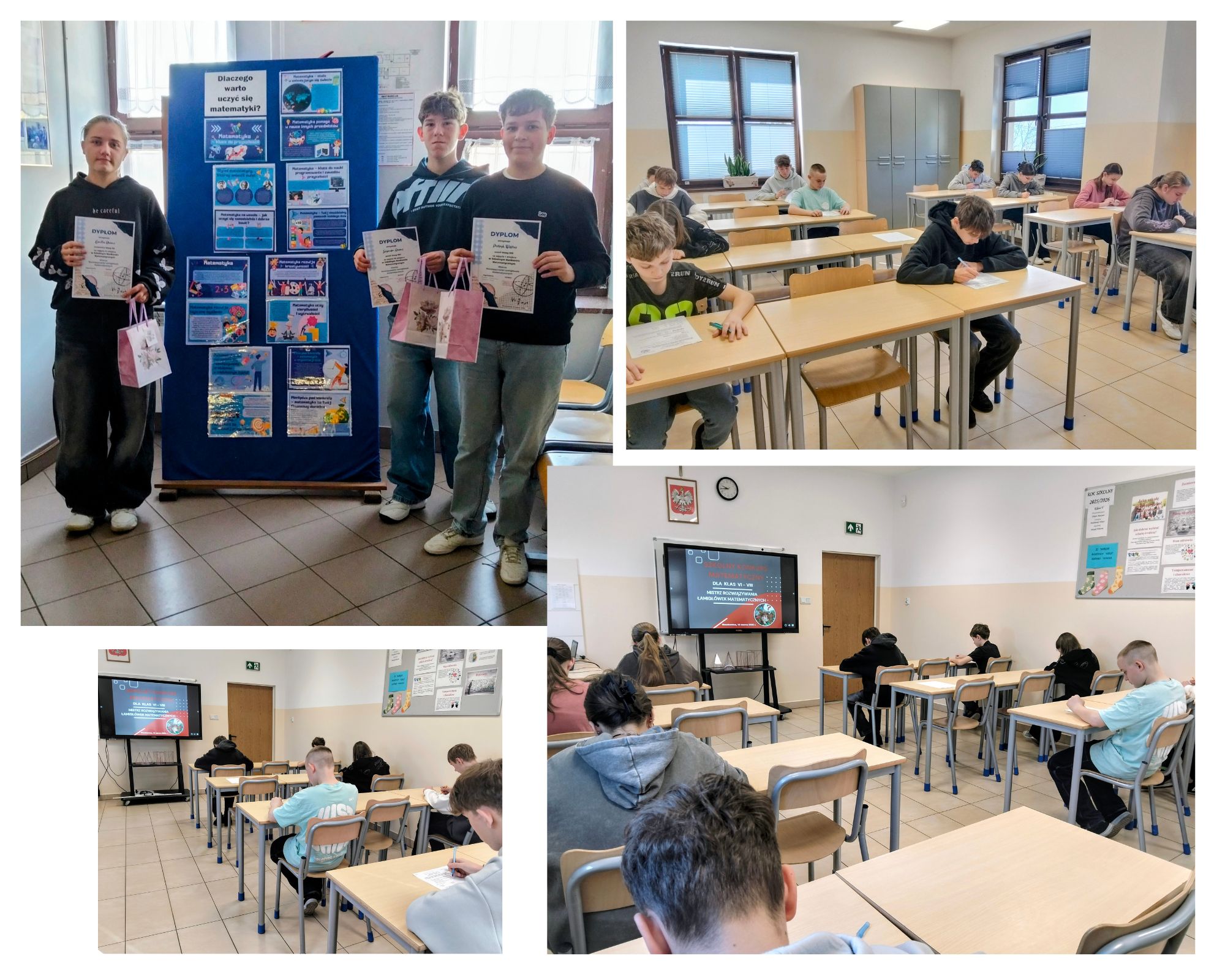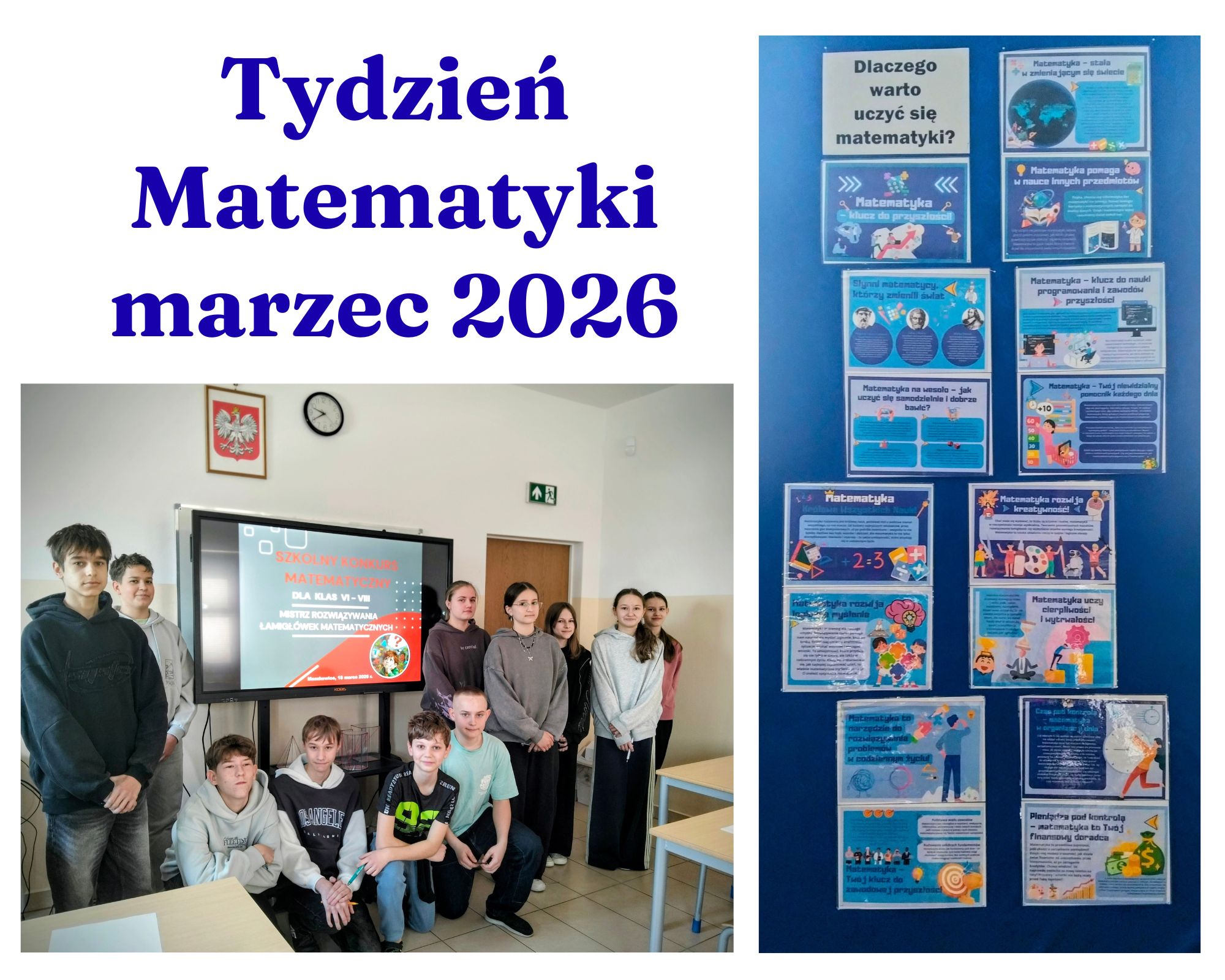 Dodatkowo, z okazji Tygodnia Matematyki, na szkolnym holu została przygotowana gazetka tematyczna, której celem było ukazanie uczniom sensu uczenia się matematyki. Prezentowane materiały pokazywały praktyczne zastosowania matematyki w życiu codziennym oraz jej obecność w różnych dziedzinach nauki i techniki. Gazetka miała zachęcić uczniów do spojrzenia na matematykę z innej perspektywy – jako narzędzie przydatne i inspirujące.
