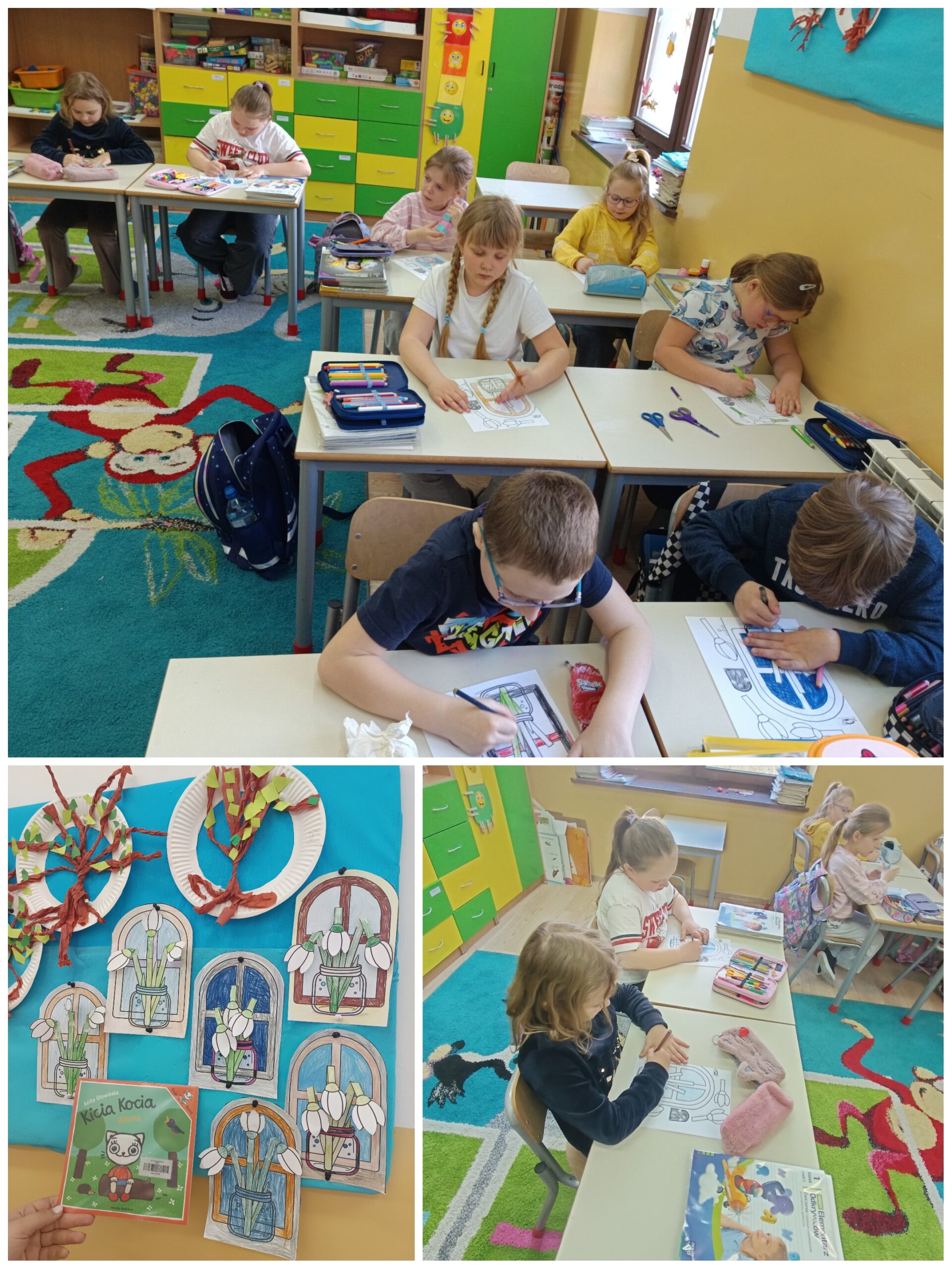 Podczas zajęć uczniowie klasy pierwszej z zainteresowaniem wysłuchali opowiadania „Kicia Kocia. Wiosna”, które wprowadziło ich w wiosenny nastrój i zachęciło do rozmowy o pierwszych oznakach tej pory roku. Dzieci chętnie dzieliły się swoimi spostrzeżeniami i opowiadały o zmianach zachodzących w przyrodzie. Po części czytelniczej uczniowie uczestniczyli w aktywności plastycznej – kolorowali przebiśniegi, rozwijając swoją kreatywność oraz zdolności manualne. Powstały piękne, kolorowe prace, które wprowadziły wszystkich w radosny, wiosenny klimat.