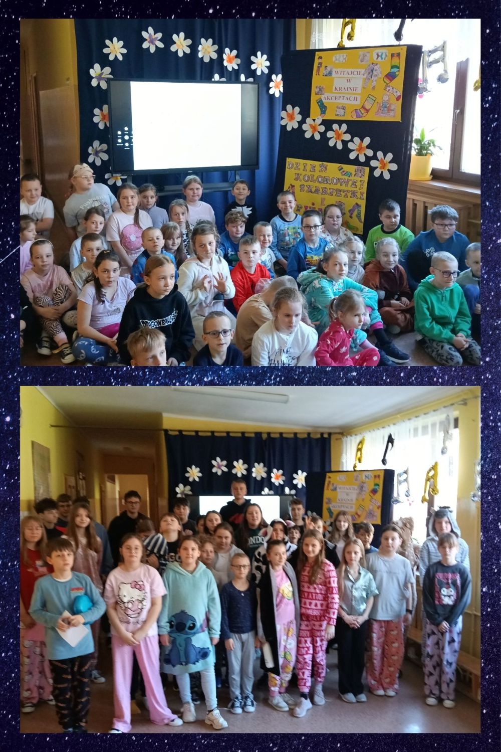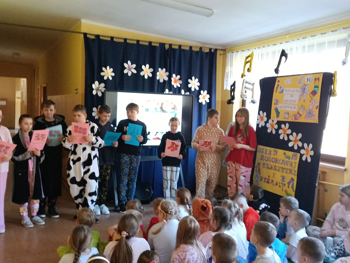23 marca odbył się krótki apel poświęcony ważnym inicjatywom społecznym organizowanym w szkole: Dniu Kolorowej Skarpetki, czyli Światowemu Dniu Osób z Zespołem Downa, oraz Dniu w Piżamie, będącemu wyrazem solidarności z dziećmi chorymi onkologicznie. Uczniowie i nauczyciele aktywnie włączyli się w obchody, zakładając kolorowe, nie do pary skarpetki oraz przychodząc do szkoły w piżamach i szlafrokach. Podczas apelu przybliżono znaczenie tych dni, zwracając uwagę na potrzebę akceptacji, szacunku i empatii wobec osób z Zespołem Downa oraz wsparcia dla dzieci zmagających się z chorobami nowotworowymi. Szczególną uwagę poświęcono idei niesienia pomocy i okazywania solidarności poprzez drobne, symboliczne gesty. Celem przeprowadzonej akcji było uwrażliwienie uczniów na potrzeby innych, kształtowanie postaw empatii i tolerancji oraz budowanie świadomości, jak ważne jest wsparcie i zrozumienie dla osób znajdujących się w trudnej sytuacji życiowej.