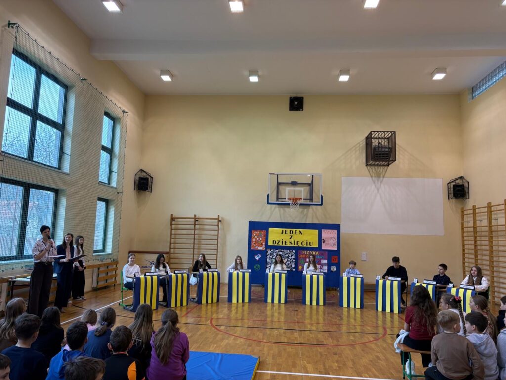 „Jeden z dziesięciu”, wzorowanego na popularnym teleturnieju telewizyjnym. W konkursie wzięli udział uczniowie klas V–VIII.